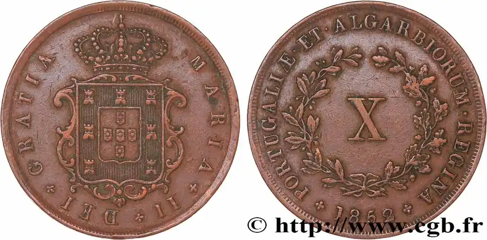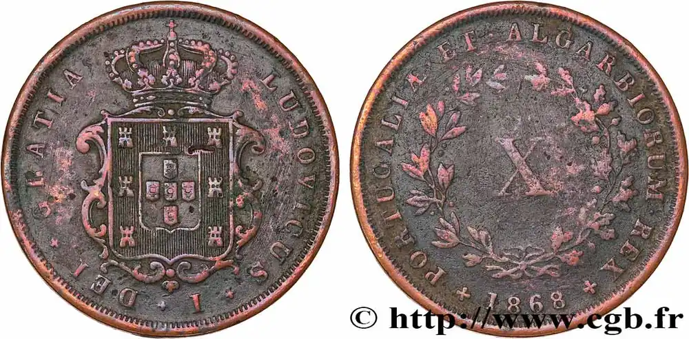 Type : 10 Réis Date : 1891Quantité frappée : 4430000Métal : bronzeDiamètre : 25 mmAxe des coins : 6 h.Poids : 5,92 g.Tranche : lisseRéférence ouvrage :Gom.02.01 – KM19/532 AversTitulature avers : CARLOS I REI DE PORTUGAL // . 1891 ..Description avers : portrait à droite de Charles Ier (Carlos).ReversTitulature revers : 10 / REIS.Description revers : entre deux rameaux.HistoriquePORTUGAL – ROYAUME DU PORTUGAL – CHARLES Ier(1889-1908)
