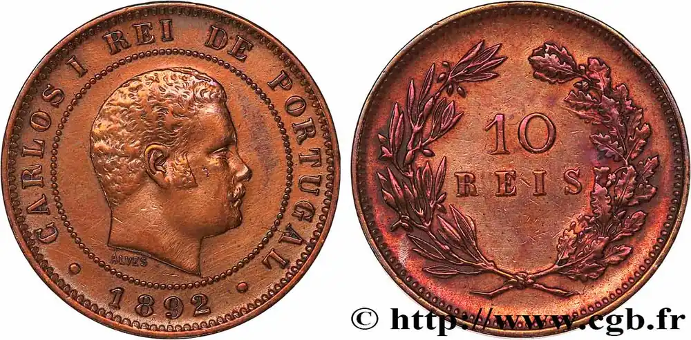 Type : 10 Réis Date : 1891Quantité frappée : 4430000Métal : bronzeDiamètre : 25 mmAxe des coins : 6 h.Poids : 5,92 g.Tranche : lisseRéférence ouvrage :Gom.02.01 – KM19/532 AversTitulature avers : CARLOS I REI DE PORTUGAL // . 1891 ..Description avers : portrait à droite de Charles Ier (Carlos).ReversTitulature revers : 10 / REIS.Description revers : entre deux rameaux.HistoriquePORTUGAL – ROYAUME DU PORTUGAL – CHARLES Ier(1889-1908)