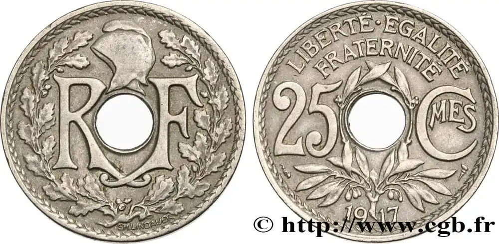 Type : 25 centimes LindauerDate : 1936Quantité frappée : 4657312Métal : cupro-nickelDiamètre : 24 mmAxe des coins : 6 h.Poids : 5,00 g.Tranche : lisseRéférence ouvrage :Classement FRANC 2023 / FRANC 2023 classificationF.171/19AversTitulature avers : R-F AUTOUR D’UN ROND PERFORÉ.Description avers : Bonnet phrygien à gauche orné d’une cocarde, dans une couronne formée de deux branches de chêne nouées par un ruban ; signé au-dessous EM. LINDAUER.ReversTitulature revers : LIBERTÉ. ÉGALITÉ / FRATERNITÉ / 25 – CMES / 19-36.Description revers : Branche d’olivier entourant un rond perforé.HistoriqueTROISIÈME RÉPUBLIQUE(4/09/1870-10/07/1940) La nouvelle de la capitulation de Sedan provoque la révolution du 4 septembre 1870 à Paris. Proclamée à l’Hôtel de Ville, la République est dotée d’un gouvernement provisoire appelé gouvernement de la Défense nationale. Menacé à gauche par l’insurrection de la Commune et à droite par les monarchistes, le nouveau régime connaît des débuts difficiles. Chef du pouvoir exécutif dans un premier temps (février 1871), Thiers est chargé de réorganiser le pays avant de choisir sa forme de gouvernement. Il devient président de la République en août 1871 et, malgré son action de libération du territoire, doit quitter son poste en mars 1873 face à l’opposition royaliste. Il est alors remplacé par Mac-Mahon favorable au rétablissement de la monarchie mais celle-ci n’est pas restaurée à la suite de la question du drapeau. La loi du septennat est alors mise en place en novembre 1873 puis, en 1875, sont votées les lois fondamentales qui servent de Constitution à la Troisième République. Régime parlementaire, elle se caractérise notamment par la nette prépondérance du pouvoir législatif sur le pouvoir exécutif. Anticléricale, la Troisième République rend l’école gratuite, laïque et obligatoire mais continue la politique coloniale pour ses ambitions économiques, stratégiques et morales. La séparation des Églises et de l’État est votée en 1905. L’idée d’une revanche sur l’Allemagne et un nationalisme important sont au cœur de la crise boulangiste, du scandale de Panama ou de l’affaire Dreyfus des années 1886-1899 tandis que la politique étrangère est très active notamment au Maroc et que la course aux armements se développe. La Première Guerre mondiale coûte cher à la France qui ne se relève qu’à partir de 1920 voire 1928 pour la monnaie avec le franc « Poincaré ». La crise de 1929 ne se fait sentir qu’à partir de 1932 mais dure jusqu’en 1939, période durant laquelle l’instabilité ministérielle est très importante. Vacillant en 1934, la Troisième République trouve un nouveau ciment unitaire avec l’antifascisme qui permet l’arrivée au pouvoir du Front populaire en 1936. Mais, paralysée face à l’Allemagne, la France va alors s’enliser dans une « drôle de guerre » puis connaître l’une des plus grandes défaites de son histoire en juin 1940. Réunies en Assemblée nationale à Vichy le 10 juillet 1940, les Chambres, pourtant élues en 1936, votent les pleins pouvoirs à Pétain dans une sorte de suicide collectif par 569 voix pour, 80 voix contre et 18 abstentions.