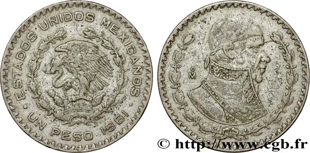 Type : 1 Peso Jose Morelos y PavonDate : 1976Nom de l’atelier/ville : MexicoQuantité frappée : 94489000Métal : nickelDiamètre : 29 mmPoids : 8,84 g.Tranche : striéeRéférence ouvrage :KM20/460 AversTitulature avers : ESTADOS UNIDOS MEXICANOS.Description avers : aigle perché sur un figuier de Barbarie dévorant un serpent.ReversTitulature revers : UN PESO // (DATE).Description revers : portrait à droite de Jose Morelos y Pavon.HistoriqueMEXIQUE