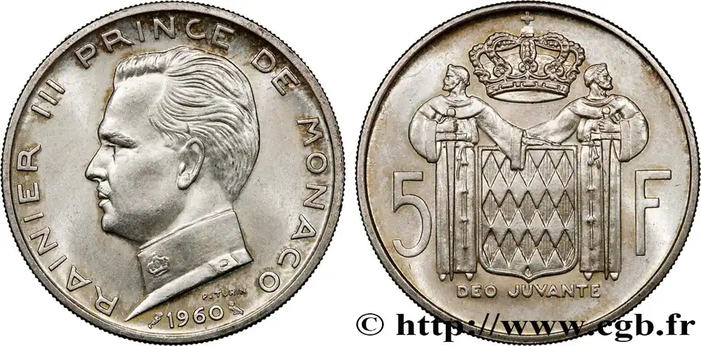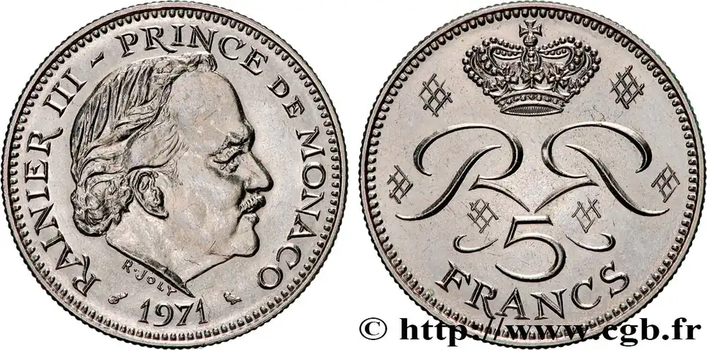 Type : 5 Francs Rainier IIIDate : 1975Nom de l’atelier/ville : ParisQuantité frappée : 14000Métal : cupro-nickelDiamètre : 29 mmAxe des coins : 6 h.Poids : 10 g.Tranche : striéeRéférence ouvrage :G.2019.153 – KM20/150 AversTitulature avers : RAINIER III PRINCE DE MONACO / 1975.Description avers : Tête de Rainier III à droite.ReversTitulature revers : 5 / FRANCS.Description revers : Deux R entrelacés et opposés sour une couronne princière.HistoriqueMONACO