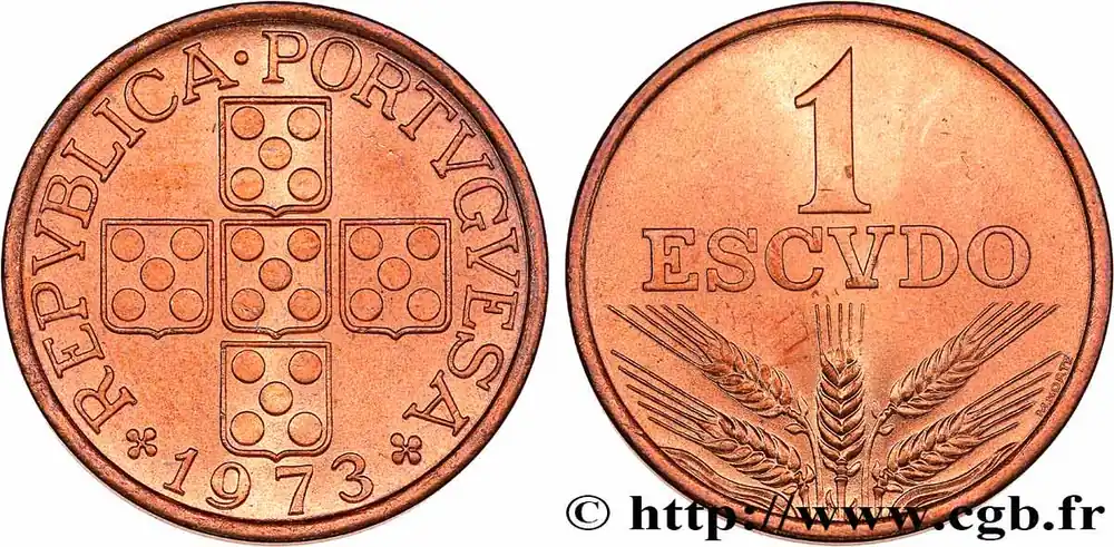 Type : 1 EscudoDate : 1973Quantité frappée : 20467000Métal : bronzeDiamètre : 26 mmAxe des coins : 6 h.Poids : 8 g.Tranche : lisseRéférence ouvrage :KM20/597 AversTitulature avers : REPVBLICA PORTVGVESA // ✤1974✤.Description avers : Cinq écus en croix.ReversTitulature revers : 1 / ESCVDO.Description revers : épis de blé.HistoriquePORTUGAL