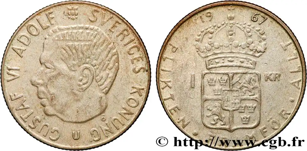 Type : 1 Krona Gustave VIDate : 1965Quantité frappée : 18638500Métal : argentTitre en millième : 400 ‰Diamètre : 25 mmAxe des coins : 12 h.Poids : 7 g.Tranche : canneléeRéférence ouvrage :KM20/826 AversTitulature avers : GUSTAF VI ADOLF SVERIGES KONUNG // U // Õ.Description avers : Tête à gauche de Gustave VI de Suède.Traduction avers : (Gustave VI Adolphe roi de Suède).ReversTitulature revers : 19 – 65 // 1 – KR // PLIKTEN·FRAMFÖR·ALLT.Description revers : Écu couronné au centre.Traduction revers : (Le devoir avant tout).HistoriqueSUÈDE