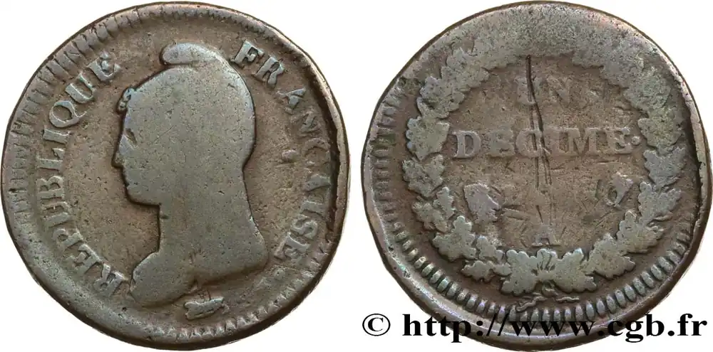 Type : Un décime Dupré, grand module, « refrappage » du 2 décimesDate : An 5 (1796-1797)Nom de l’atelier/ville : ParisQuantité frappée : 12463719Métal : cuivreDiamètre : 32 mmAxe des coins : 6 h.Poids : 16,20 g.Tranche : macléeDegré de rareté : R1Commentaires sur l’état de conservation :Exemplaire de poids légerRéférence ouvrage :Classement FRANC 2023 / FRANC 2023 classificationF.128/1AversTitulature avers : REPUBLIQUE FRANÇAISE..Description avers : Buste drapé de la Liberté à gauche coiffée du bonnet phrygien (Mesdames Tallien ou Récamier) ; signé Dupré cursif au-dessous.ReversTitulature revers : UN / DÉCIME..Description revers : En deux lignes dans le champ, au-dessus de L’AN 5 suivi d’un point et de la lettre d’atelier A encadrés des différents, dans une couronne fermée composée de deux branches de chêne opposées nouées à leur base par un ruban.HistoriqueDIRECTOIRE(26/10/1795-9-10/11/1799) Lors de la séparation de la Convention, le 25 octobre 1795, un nouveau pouvoir exécutif prévu par la constitution thermidorienne se met en place. Cette constitution prévoit de confier le pouvoir à un directoire de cinq membres dont chacun préside à tour de rôle avec remplacement d’un membre tous les deux ans. Ce directoire nomme les ministres et les fonctionnaires, dirige la politique étrangère et fait exécuter les lois mais il ne les élabore pas et n’a aucun contrôle des deniers publics. Le pouvoir est partagé avec deux chambres : le Conseil des Cinq-Cents et le Conseil des Anciens qui forment le Corps législatif. Ce pouvoir est résolu à se maintenir face au risque d’une restauration monarchique ou d’une réaction jacobine mais il est surtout paralysé par la crise financière et doit renoncer à l’assignat en 1796. Le remplacement des assignats par les mandats territoriaux n’inspire pas plus de confiance et cette nouvelle monnaie fiduciaire est supprimée en 1797. Face à la misère et aux tentatives de déstabilisation, le Directoire, accusé d’être une « république bourgeoise », revient aux mesures révolutionnaires et policières. Par ailleurs, depuis 1792, la guerre est ininterrompue et l’influence des chefs militaires est croissante. En 1799, les partisans d’un pouvoir fort, dont Sieyès, se retrouvent au Directoire et ils ouvrent la voie du pouvoir à Bonaparte, de retour d’Égypte. Le coup d’État des 18 et 19 brumaire an VIII permet l’instauration d’une dictature militaire sous le nom de Consulat.