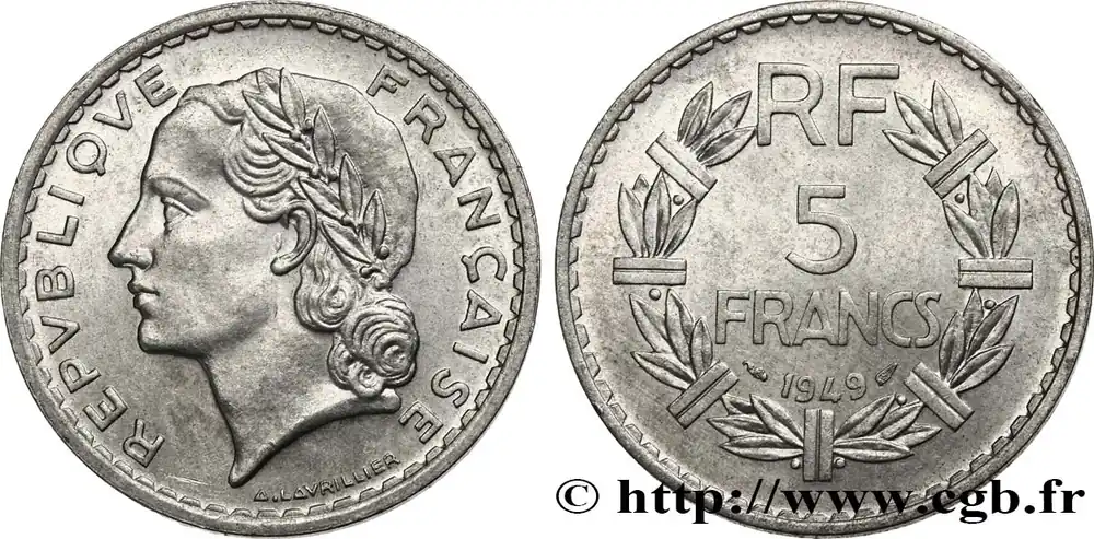 Type : 5 francs Lavrillier, aluminiumDate : 1948Nom de l’atelier/ville : Beaumont-Le-RogerQuantité frappée : 28.046.800Métal : aluminiumDiamètre : 31 mmAxe des coins : 6 h.Poids : 3,77 g.Tranche : lisseCommentaires sur l’état de conservation :Exemplaire nettoyéRéférence ouvrage :Classement FRANC 2023 / FRANC 2023 classificationF.339/15AversTitulature avers : REPVBLIQVE FRANÇAISE.Description avers : tête laurée de la République aux cheveux longs à gauche ; au-dessous signé A. LAVRILLIER le long du listel.ReversTitulature revers : RF / 5 / FRANCS / (MILLÉSIME).Description revers : en quatre lignes dans le champ au-dessus du millésime encadré des différents, le tout dans une couronne de laurier ornée de sept bagues.CommentaireExemplaire avec le 9 ouvert.HistoriqueQUATRIÈME RÉPUBLIQUE(16/01/1947-8/01/1959) Se caractérisant par un régime parlementaire doublé d’une grande instabilité ministérielle, la Quatrième République a pour particularité de n’avoir jamais été officiellement proclamée. En effet, De Gaulle, lors de son arrivée à Paris le 25 août 1944, refuse de le faire sous prétexte que la République n’avait jamais cessé d’exister. Considérant que l’État français du maréchal Pétain n’était qu’un simple état de fait, il estime que la République a survécu dans la France libre et son acte de naissance doit alors être le 18 juin 1940. Toutefois, son départ, le 20 janvier 1946, et le référendum du 13 octobre 1946 approuvant une nouvelle Constitution, marquent le début officiel de cette république. Elle connaît deux présidents : Vincent Auriol (16/01/1947 – 23/12/1953) et René Coty (23/12/1953 – 8/1/1959). La crise ouverte causée par la révolte de l’armée d’Algérie entraîne, en 1958, sa chute qui est confirmée par l’adoption d’une nouvelle constitution le 28 septembre 1958. Néanmoins, elle ne cesse définitivement d’être que le 8 janvier 1959 lors de l’installation du général de Gaulle comme président de la Ve République.