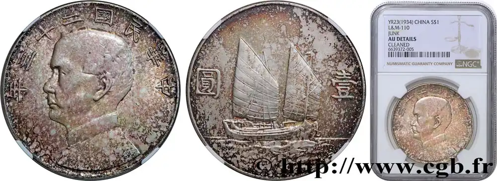 Type : 1 Dollar Sun Yat-Sen an 23Date : 1934Quantité frappée : 128740000Métal : argentTitre en millième : 880 ‰Diamètre : 39 mmAxe des coins : 12 h.Poids : 26,70 g.Tranche : canneléeSlabPCGS : AUCommentaires sur l’état de conservation :Exemplaire sous coque PCGS Genuine Cleaned AU DetailRéférence ouvrage :KM20/345 AversTitulature avers : LÉGENDE EN CHINOIS.Description avers : buste à gauche de Sun Yat-Sen.ReversTitulature revers : LÉGENDE EN CHINOIS.Description revers : jonque.HistoriqueCHINE