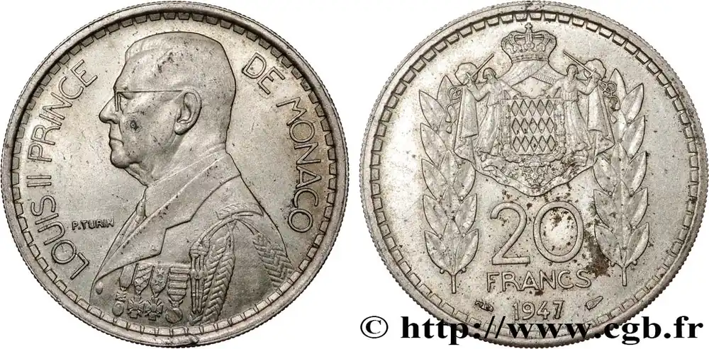 Type : 20 Francs prince Louis IIDate : 1947Nom de l’atelier/ville : ParisQuantité frappée : 1000000Métal : cupro-nickelDiamètre : 30 mmAxe des coins : 6 h.Poids : 10,04 g.Tranche : striéeRéférence ouvrage :G.2019.137 – KM20/124 AversTitulature avers : LOUIS II PRINCE DE MONACO.Description avers : Buste à gauche en grand uniforme.ReversTitulature revers : 20/ FRANCS/ 1947.Description revers : Armoiries de Monaco entourée de deux branches de laurier.HistoriqueMONACO