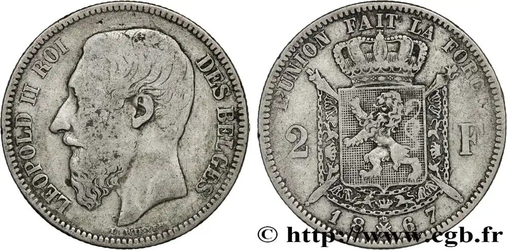 Type : 2 Francs Léopold II légende françaiseDate : 1866Quantité frappée : 1942000Métal : argentTitre en millième : 835 ‰Diamètre : 27 mmAxe des coins : 6 h.Poids : 9,9 g.Tranche : striéeRéférence ouvrage :KM.19/30.1 AversTitulature avers : LEOPOLD II ROI DES BELGES // L WIENER.Description avers : Tête nue de Léopold II à gauche.ReversTitulature revers : L’UNION FAIT LA FORCE.Description revers : Écu couronné aux armes de Belgique.CommentaireSignature à l’avers L WIENER.HistoriqueBELGIQUE