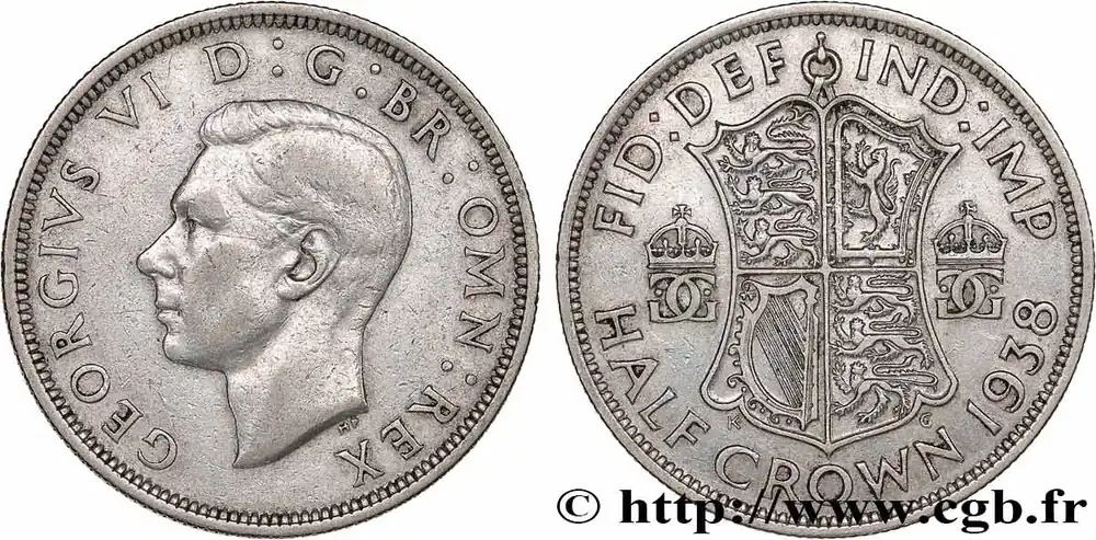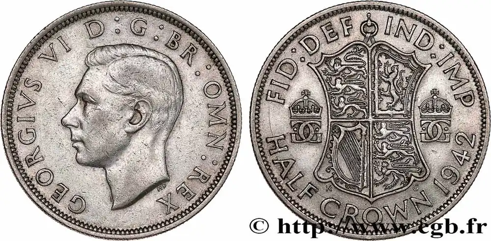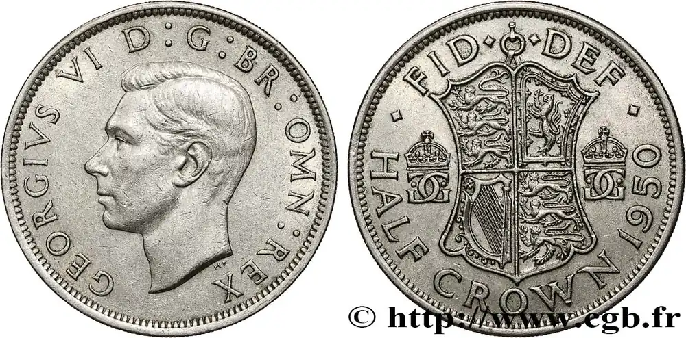 Type : 1/2 Crown Georges VIDate : 1948Quantité frappée : 71165000Métal : cupro-nickelDiamètre : 32,30 mmAxe des coins : 12 h.Poids : 14,00 g.Tranche : canneléeRéférence ouvrage :KM20/866 – Sp.4101 AversTitulature avers : GEORGIVS VI D:G:BR:OMN:REX.Description avers : portrait à gauche du roi Georges VI.ReversTitulature revers : FID:DEF-IND:IMP // HALF CROWN 1948.Description revers : lettres G entrelacées et couronnées de chaque côté d’un écu.HistoriqueROYAUME-UNI