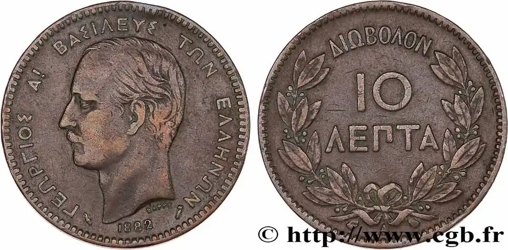 Type : 10 Lepta Georges IerDate : 1869Nom de l’atelier/ville : Strasbourg – BBQuantité frappée : 14994000Métal : cuivreDiamètre : 30 mmAxe des coins : 6 h.Poids : 9,74 g.Tranche : lisseRéférence ouvrage :KM.19/43 AversTitulature avers : (LÉGENDE EN GREC) ΓΕΩΡΓΙΟΣ Α! ΒΑΣΙΛΕΥΣ ΤΩΝ ΕΛΛΗΝΩΝ / ΒΑΡΡΕ /1869.Description avers : portrait à gauche du roi Georges ier.Légende avers : ΓΕΩΡΓΙΟΣ Α! ΒΑΣΙΛΕΥΣ ΤΩΝ ΕΛΛΗΝΩΝ / ΒΑΡΡΕ /1869Traduction avers : (GEROGES Ier ROI DES HELLÈNES / BARRE / 1869).ReversTitulature revers : (LÉGENDE EN GREC) ΔΙΩΒΟΛΟΝ / 10 / ΛΕΠΤΑ / BB.Description revers : entre deux rameaux.Légende revers : ΔΙΩΒΟΛΟΝ / 10 / ΛΕΠΤΑ / BBTraduction revers : (DIOBOLE / 10 / LEPTA / BB).HistoriqueGRÈCE