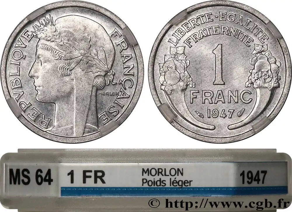 Type : 1 franc Morlon, légèreDate : 1958Nom de l’atelier/ville : Beaumont-Le-RogerQuantité frappée : 13.412.000Métal : aluminiumDiamètre : 23 mmAxe des coins : 6 h.Poids : 1,29 g.Tranche : lisseRéférence ouvrage :Classement FRANC 2023 / FRANC 2023 classificationF.221/22AversTitulature avers : REPVBLIQVE FRANÇAISE.Description avers : buste drapé de la République aux cheveux courts à gauche, coiffée d’un bonnet phrygien orné d’une cocarde tricolore (centre guilloché, cercle lisse, cercle guilloché), sous une couronne composite de blé, chêne et olivier nouée par un ruban ; sous le ruban MORLON.ReversTitulature revers : LIBERTE – EGALITE / FRATERNITE.Description revers : 1 / FRANC, en deux lignes au-dessus du millésime encadré des différents, le tout entre deux cornes d’abondance symétriquement opposées.HistoriqueCINQUIÈME RÉPUBLIQUE(depuis le 08/01/1959) La Cinquième République, dont la constitution a été approuvée par référendum le 28 septembre 1958 par plus de 79 % des Français, ne débute officiellement qu’avec l’installation du général de Gaulle comme président le 8 janvier 1959. La constitution est modifiée le 28 octobre 1962 par référendum où une majorité de 62 % des voix approuve l’élection du président de la République au suffrage universel direct. Les différents présidents de la Ve République sont Charles de Gaulle (8/01/1959 – 27/04/1969, retrait et Alain Poher devient président par intérim), Georges Pompidou (15/06/1969 – 2/04/1974, décédé, Alain Poher devient président par intérim), Valéry Giscard d’Estaing (19/05/1974 – 21/05/1981), François Mitterrand (21/05/1981 – 7/05/1995), Jacques Chirac (7/05/1995 – 16/05/2007) , Nicolas Sarkozy (16/05/2007 – 15/05/2012), François Hollande (15/05/2012 – 14/05/2017) et Emmanuel Macron (14/05/2017 – ).
