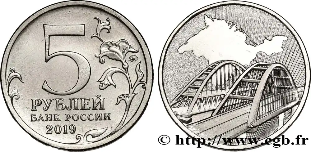Type : 5 Roubles 5e anniversaire du rattachement de la Crimée à la RussieDate : 2019Nom de l’atelier/ville : MoscouQuantité frappée : 2000000Métal : acier plaqué nickelDiamètre : 24 mmAxe des coins : 12 h.Tranche : canneléeRéférence ouvrage :KM21/- AversTitulature avers : (LÉGENDE EN CYRILLIQUE) 5 / РУБЛЕЙ / БАНК РОССИИ / 2019.Description avers : dans le champ, décor floral.Traduction avers : 5 / ROUBLES / BANQUE DE RUSSIE / 2019.ReversDescription revers : pont du détroit de Kertch.CommentaireCette monnaie commémore le 5e anniversaire du référendum sur le statut de la Crimée et de Sébastopol et le rattachement de la Crimée à la Russie. Inauguré en 2018, un pont routier et ferroviaire permet de franchir le détroit de Kertch entre la Mer d’Azov et la Mer Noire.HistoriqueRUSSIE