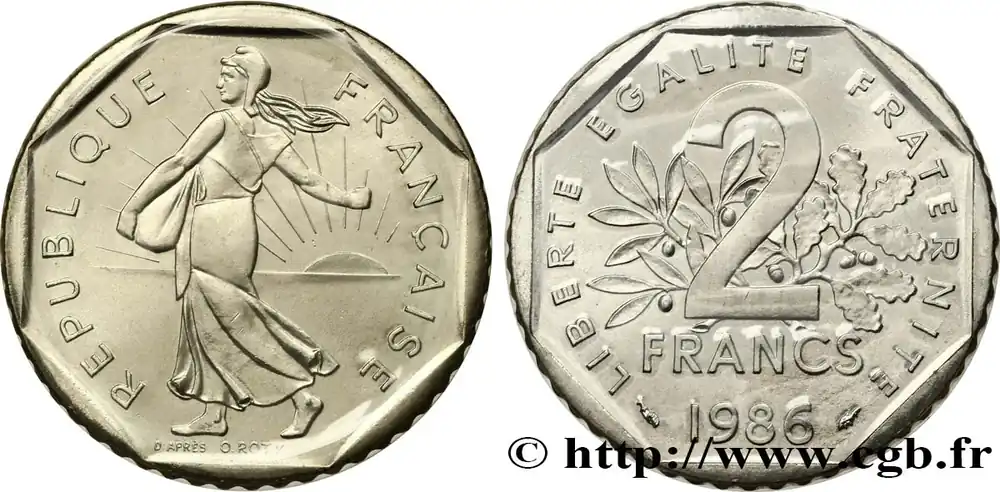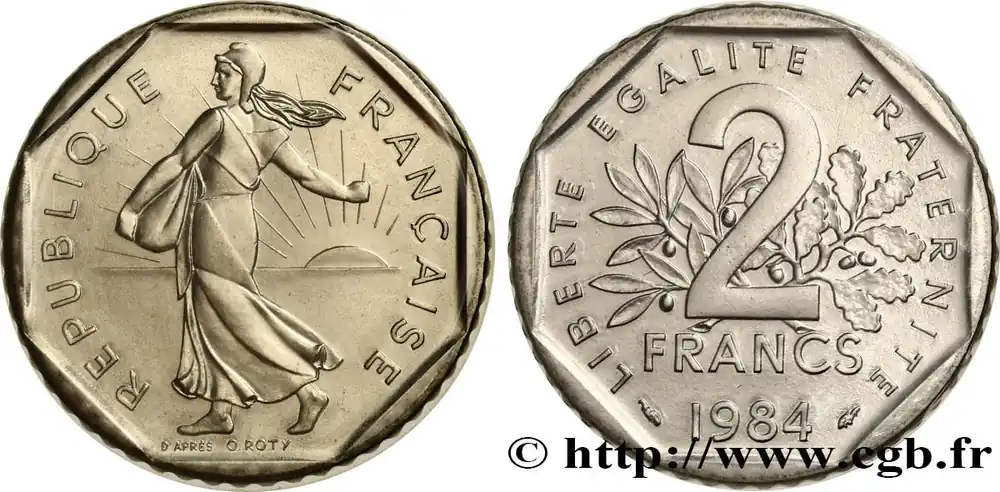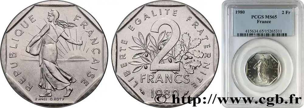Type : 2 francs Semeuse, nickelDate : 1982Nom de l’atelier/ville : PessacQuantité frappée : 90002511Métal : nickelDiamètre : 26,5 mmAxe des coins : 6 h.Poids : 7,50 g.Tranche : canneléeRéférence ouvrage :Classement FRANC 2023 / FRANC 2023 classificationF.272/6AversTitulature avers : REPUBLIQUEFRANÇAISE..Description avers : La République à gauche, sous les traits d’une semeuse drapée et coiffée d’un bonnet phrygien, aux cheveux longs, marchant et semant à contre-vent ; en arrière-plan, derrière la semeuse à droite, un soleil levant ; au-dessous, D’APRÈS O. ROTY.ReversTitulature revers : LIBERTE EGALITE FRATERNITE..Description revers : 2 / FRANCS, brochant sur une branche d’olivier et une branche de chêne entrecroisées à leur base ; au-dessous 1982 encadré des différents.CommentaireExemplaire Fleur De Coin sous plastique issu d’une série.HistoriqueCINQUIÈME RÉPUBLIQUE(depuis le 08/01/1959) La Cinquième République, dont la constitution a été approuvée par référendum le 28 septembre 1958 par plus de 79 % des Français, ne débute officiellement qu’avec l’installation du général de Gaulle comme président le 8 janvier 1959. La constitution est modifiée le 28 octobre 1962 par référendum où une majorité de 62 % des voix approuve l’élection du président de la République au suffrage universel direct. Les différents présidents de la Ve République sont Charles de Gaulle (8/01/1959 – 27/04/1969, retrait et Alain Poher devient président par intérim), Georges Pompidou (15/06/1969 – 2/04/1974, décédé, Alain Poher devient président par intérim), Valéry Giscard d’Estaing (19/05/1974 – 21/05/1981), François Mitterrand (21/05/1981 – 7/05/1995), Jacques Chirac (7/05/1995 – 16/05/2007) , Nicolas Sarkozy (16/05/2007 – 15/05/2012), François Hollande (15/05/2012 – 14/05/2017) et Emmanuel Macron (14/05/2017 – ).