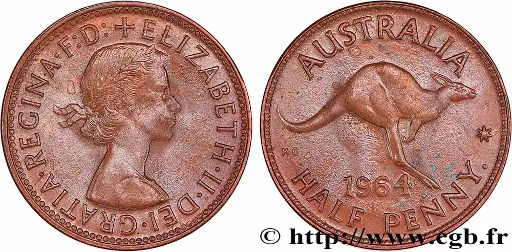 Type : 1/2 Penny Élisabeth IIDate : 1964Nom de l’atelier/ville : PerthQuantité frappée : 18230000Métal : bronzeDiamètre : 25,5 mmAxe des coins : 12 h.Poids : 5,67 g.Tranche : lisseRéférence ouvrage :KM20/61 AversTitulature avers : +ELIZABETH·II·DEI·GRATIA·REGINA·F:D: .Description avers : buste lauré à droite de la reine Élisabeth II.ReversTitulature revers : AUSTRALIA // 1964 / HALF PENNY..Description revers : kangourou bondissant à droite.CommentaireLes frappes de l’atelier de Perth sont reconnaissables par la présence d’un point après le mot PENNY.HistoriqueAUSTRALIE
