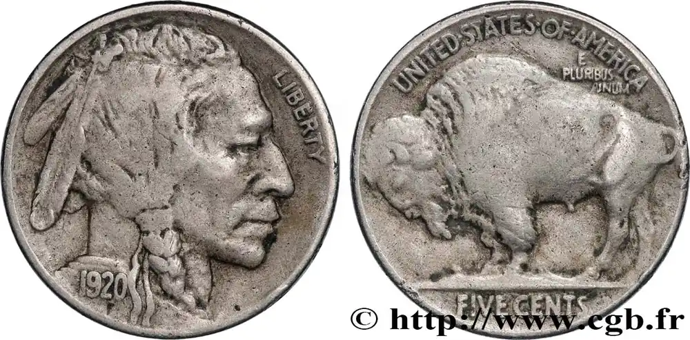 Type : 5 Cents Tête d’indien ou BuffaloDate : 1923Nom de l’atelier/ville : PhiladelphieQuantité frappée : 35715000Métal : cupro-nickelDiamètre : 21,2 mmAxe des coins : 6 h.Poids : 5 g.Tranche : lisseRéférence ouvrage :KM20/134  – Y.- AversTitulature avers : LIBERTY // 1929.Description avers : tête d’indien à droite.Traduction avers : (Liberté).ReversTitulature revers : UNITED STATES OF AMERICA // E / PLURIBUS / UNUM // FIVE CENTS.Description revers : bison à gauche.Traduction revers : (États-Unis d’Amérique // de plusieurs, un).CommentaireLa lettre F en creux située sous la date correspond à l’iitiale du nom du graveur, James Earle Fraser. Ce type a été frappé de 1913 à 1937.HistoriqueÉTATS-UNIS D’AMÉRIQUE