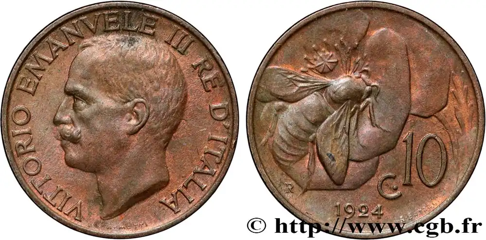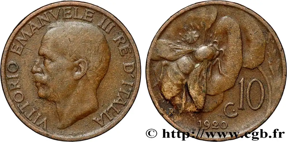 Type : 10 Centesimi Victor Emmanuel IIIDate : 1922Nom de l’atelier/ville : Rome – RQuantité frappée : 45217487Métal : cuivreDiamètre : 22,5 mmAxe des coins : 6 h.Poids : 5,33 g.Tranche : lisseRéférence ouvrage :Mont.331  – KM20/60 AversTitulature avers : VITTORIO EMANVELE III RE D’ITALIA.Description avers : portrait à gauche.ReversTitulature revers : C.10 / 1922.Description revers : abeille butinant une fleur.HistoriqueITALIE