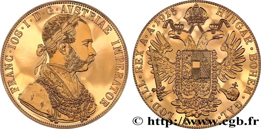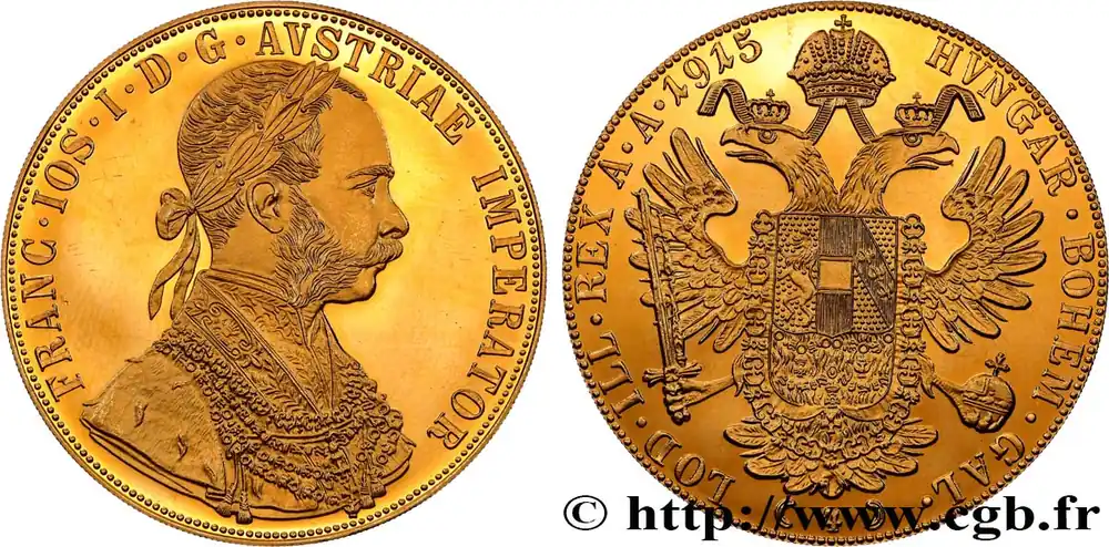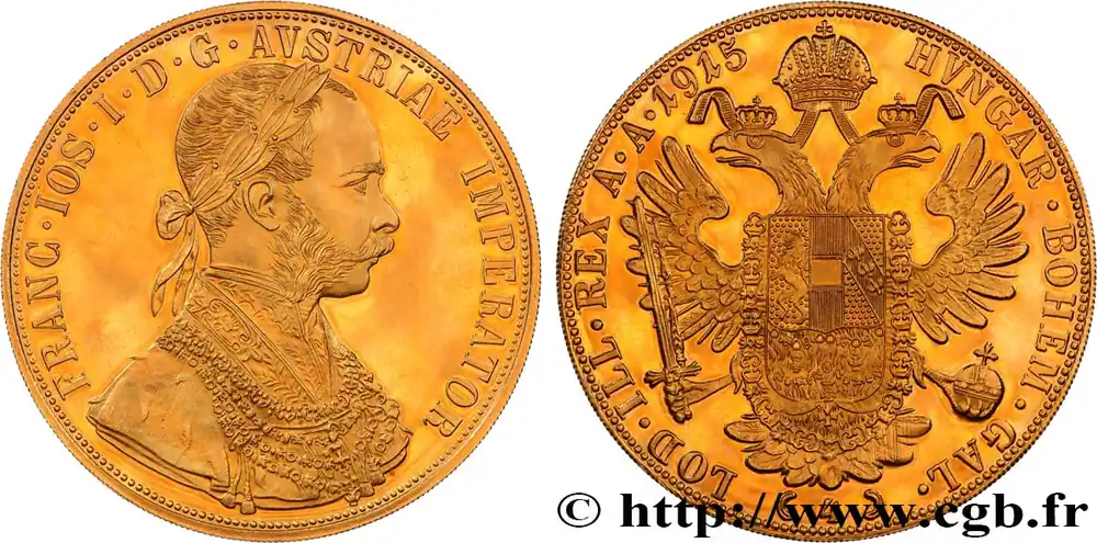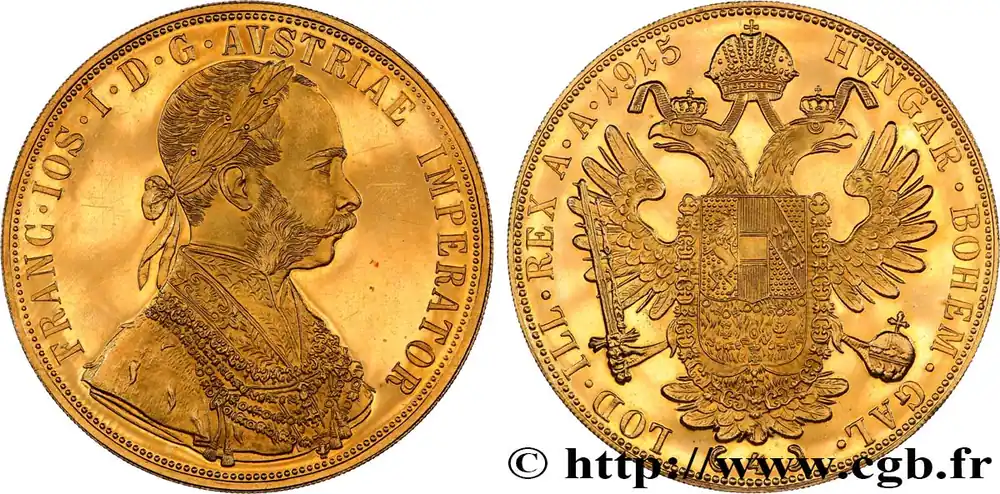 Type : 4 Ducats, refrappe moderne François Joseph Date : 1915Métal : orTitre en millième : 986 ‰Diamètre : 40 mmAxe des coins : 12 h.Poids : 13,96 g.Référence ouvrage :KM20/2276 AversTitulature avers : FRANC. IOS. I. D. G. AVSTRIAE IMPERATOR.Description avers : Buste habillé à droite de François Ier, la tête laurée.Traduction avers : (François Ier par la grâce de Dieu empereur d’Autriche).ReversTitulature revers : HVNGAR. BOHEM. GAL./ ( 4 )/ LOD. ILL. REX A. A. 1915.Description revers : Aigle bicéphale couronnée, les ailes déployées, tenant dans ses serres une épée et un monde ; en cœur, un écu entouré du collier de la Toison d’or.CommentaireLes monnaies autrichiennes datées 1915 sont des refrappes modernes.HistoriqueOR, PALLADIUM ET PLATINE INVESTISSEMENTSécurisez et diversifiez votre épargne avec les métaux précieux :Dans un contexte d’instabilité politique et économique croissante, diversifier son épargne peut être une démarche judicieuse. Les métaux précieux comme l’or, le palladium et le platine constituent des actifs tangibles souvent prisés en raison de leur caractère intemporel et de leur résilience face aux fluctuations des marchés.Pour répondre à des besoins variés, l’achat de pièces officielles en or, palladium ou platine est une option flexible et adaptée. Ces pièces, disponibles à l’unité ou en lot, permettent à chacun d’ajuster ses choix selon ses objectifs et son budget, sans engagement à long terme.Un processus simple et sécurisé :Nous proposons une livraison sécurisée et garantie. Les paiements peuvent être effectués par carte bancaire ou par virement, bien que certaines transactions puissent nécessiter un règlement exclusivement par virement bancaire. Une pièce d’identité valide (carte nationale d’identité ou passeport) sera demandée pour finaliser votre achat.Stockage en toute sécurité et confidentialité :Le département Investissement de CGB Numismatique Paris met à votre disposition des solutions de stockage offrant une sécurité renforcée et une confidentialité optimale pour vos achats en or, palladium et platine.Contactez-nous pour plus d’informations :Pour toute question ou pour passer commande, prenez contact avec notre responsable des achats/ventes de métaux précieux : par email à [email protected] ou par téléphone. Nous mettons à votre disposition des informations générales et des services pour vous accompagner dans vos projets d’investissement.CGB Numismatique Paris agit en tant que fournisseur de métaux précieux et ne fournit aucun conseil en investissement. La valeur des métaux précieux peut fluctuer, et les performances passées ne garantissent pas les résultats futurs. L’achat de métaux précieux doit être considéré comme une stratégie de préservation de valeur plutôt qu’un investissement spéculatif. Conformément à l’article L.221-28 du Code de la consommation, le droit de rétractation ne s’applique pas aux achats d’or d’investissement, dont le prix dépend des fluctuations des marchés financiers.