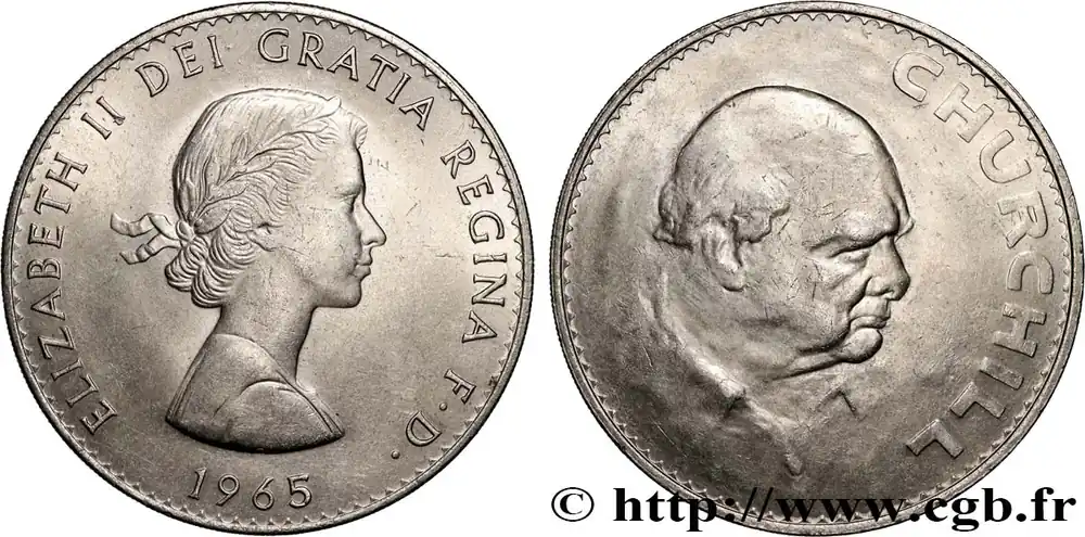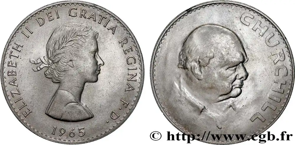 Type : 1 Crown Winston ChurchillDate : 1965Quantité frappée : 9640000Métal : cupro-nickelDiamètre : 38,61 mmAxe des coins : 12 h.Poids : 27,93 g.Tranche : striéeRéférence ouvrage :KM20/910 AversTitulature avers : ELIZABETH II DEI GRATIA REGINA D. F. / 1965.Description avers : Buste à droite lauré de la reine Élisabeth II.ReversTitulature revers : CHURCHILL.Description revers : portrait de trois quart à droite de Winston Churchill.HistoriqueROYAUME-UNI