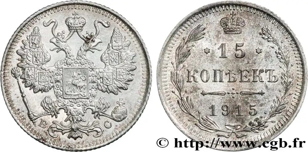 Type : 15 KopecksDate : 1912Nom de l’atelier/ville : Saint-PetersbourgQuantité frappée : 29000000Métal : argentTitre en millième : 750 ‰Diamètre : 20 mmAxe des coins : 12 h.Poids : 2,77 g.Tranche : striéeRéférence ouvrage :KM20/21a.2 AversTitulature avers : (LÉGENDE CYRILLIQUE) ЭБ.Description avers : Aigle bicéphale héraldique couronné.ReversTitulature revers : (LÉGENDE CYRILLIQUE) * 15 * / КОПѢЕКЪ / 1912 / С.П.Б..Description revers : Légende cyrillique dans une couronne formée d’une branche d’olivier et d’une branche de chêne surmontée d’une petite couronne.Traduction revers : (15 Kopeks) 1912.HistoriqueRUSSIE