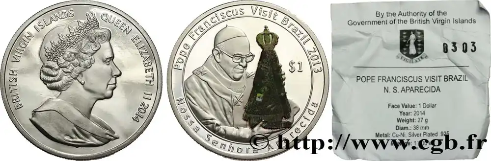 Type : 1 Dollar Proof visite du pape François au BrésilDate : 2014Quantité frappée : 1000Métal : cupro-nickelDiamètre : 38,60 mmAxe des coins : 12 h.Poids : 27 g.Commentaires sur l’état de conservation :revers partiellement coloriséRéférence ouvrage :KM21/- AversTitulature avers : BRITISH VIRGIN ISLANDS QUEEN ELIZABETH II 2014.Description avers : portrait couronné à droite de la reine Élisabeth II .ReversTitulature revers : POPE FRANCISCUS VISIT BRAZIL 2013 // $1 // NOSSA SENHORA APARECIDA.Description revers : Pape François tenant Notre-Dame d’Aparecida, sainte patronne du Brésil (colorisée).CommentaireCertificat n°296.HistoriqueÎLES VIERGES BRITANNIQUES