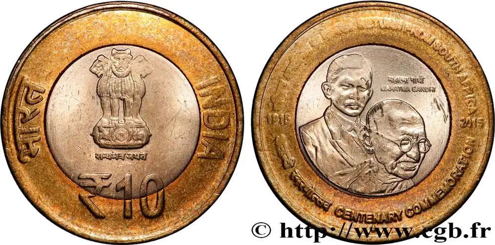 Type : 10 Roupies retour d’Afrique du Sud de GandhiDate : 2015Quantité frappée : -Métal : bimétalliqueDiamètre : 27 mmAxe des coins : 12 h.Tranche : lisseCommentaires sur l’état de conservation :Frappe de mauvaise qualitéRéférence ouvrage :KM21/- AversTitulature avers : भारत INDIA // सत्यमेव जयते // ₹10.Description avers : lions d’Asoka.Traduction avers : (Inde).ReversTitulature revers : दक्षिण अफ्रीका से वापसी RETURN FROM SOUTH AFRICA// महात्मा गांधी / MAHATMA GANDHI // 1915 – 2015 // शताब्दी स्मरणोत्सव CENTENARY COMMEMORATION .Description revers : portraits de Gandhi en 1915 et de Gandhi vieux.CommentaireCette monnaie commémore le retour en Inde de Gandhi parti vivre en Afrique du Sud. Après des études de droits en Angleterre et un expérience peu concluante en Inde, Gandhi part exercer son métier d’avocat en Afrique du Sud de 1893 à 1915.HistoriqueINDEXXe