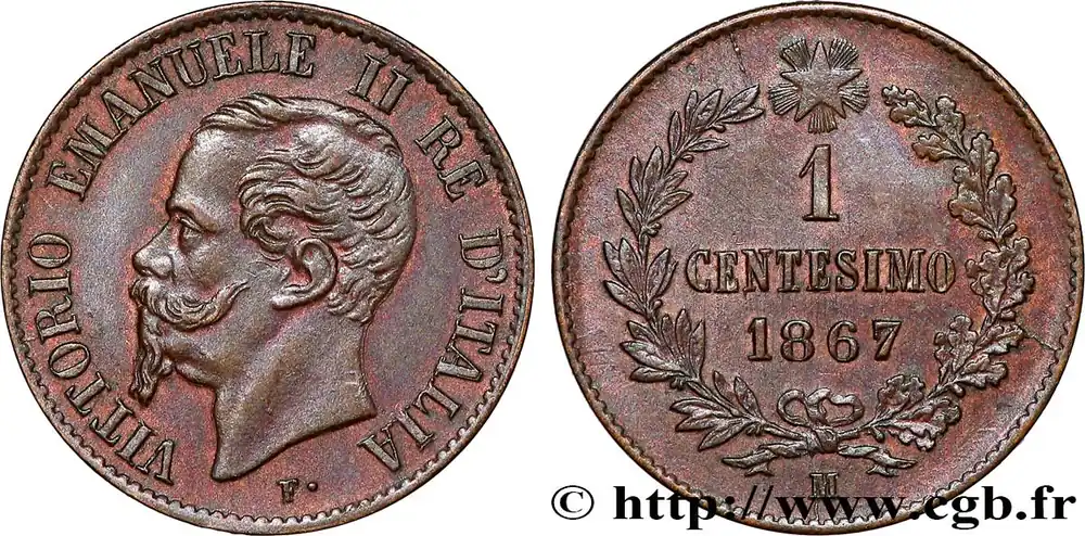 Type : 1 Centesimo Victor Emmanuel IIDate : 1867Nom de l’atelier/ville : MilanQuantité frappée : 75000000Métal : bronzeDiamètre : 15 mmAxe des coins : 6 h.Poids : 1,00 g.Tranche : lisseRéférence ouvrage :Mont.265  – KM.19/1.1 AversTitulature avers : VITTORIO EMMANUELE II RE D’ITALIA.Description avers : portrait à gauche de Victor Emmanuel II.Traduction avers : (Victor Emmanuel II roi d’Italie).ReversTitulature revers : 1 / CENTESIMO / 1867 / M.Description revers : dans le champ entre deux rameaux, et étoile.HistoriqueITALIE