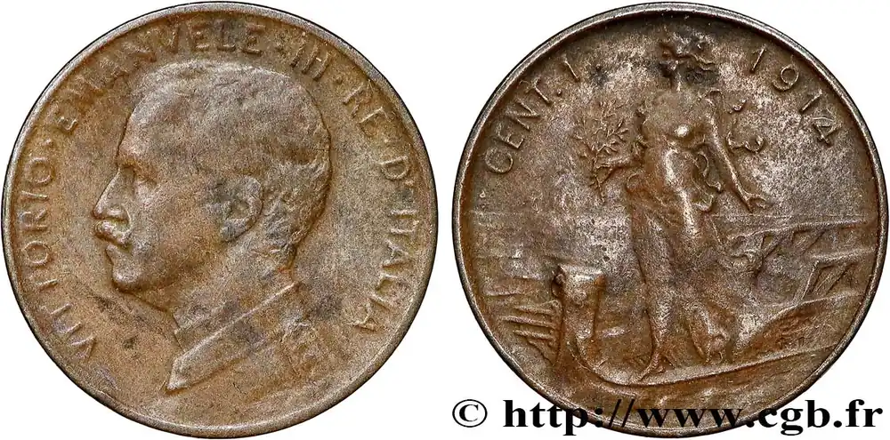 Type : 1 Centesimo Victor Emmanuel IIIDate : 1904Nom de l’atelier/ville : Rome – RQuantité frappée : 14626161Métal : cuivreDiamètre : 15 mmAxe des coins : 6 h.Poids : 1 g.Tranche : lisseRéférence ouvrage :Mont.416 – KM19/35 AversTitulature avers : VITTORIO EMMANUELE III RE D’ITALIA.Description avers : portrait à gauche du roi Victor Emmanuel III.Traduction avers : (Victor Emmanuel III roi d’Italie).ReversTitulature revers : 1 / CENTESIMO / 1904 / R.Description revers : dans le champ entre deux rameaux, et étoile.HistoriqueITALIE