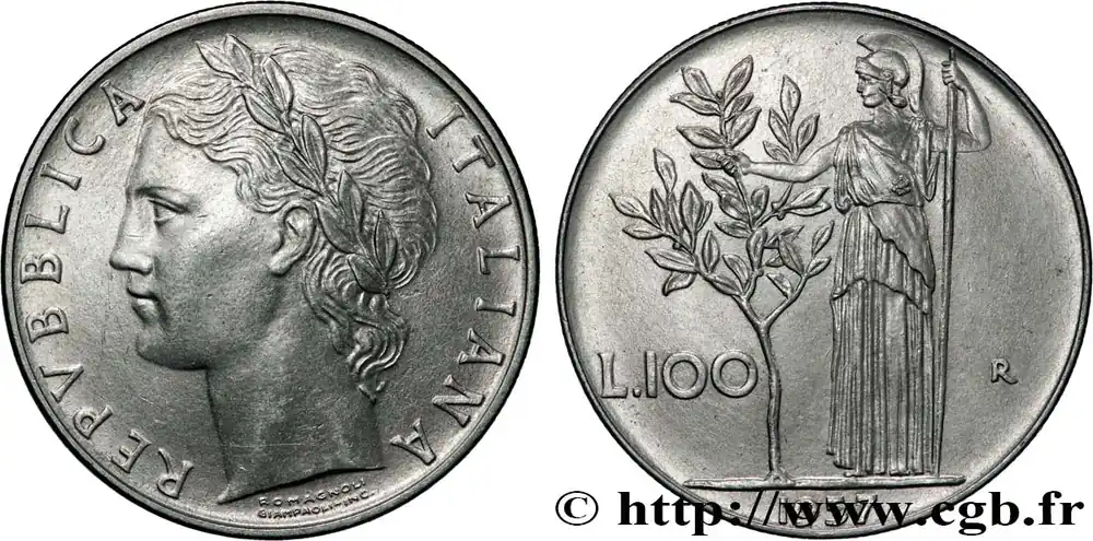 Type : 100 LireDate : 1990Nom de l’atelier/ville : Rome – RQuantité frappée : 60000000Métal : acmonitalDiamètre : 18,20 mmAxe des coins : 6 h.Poids : 3,30 g.Tranche : canneléeRéférence ouvrage :KM20/96.2 AversTitulature avers : REPVBBLICA ITALIANA // ROMAGNOLI / GIAMPAOLI INC..Description avers : Portrait lauré de l’Italie à gauche.ReversTitulature revers : L.100 – R.Description revers : Athéna debout et olivier.CommentaireLe type initial dessiné par Giuseppe Romagnoli et gravé par Pietro Giampaoli a été frappé entre 1950 et 1989 avec un diamètre de 27,8 mm pour un poids de 8 g. Entre 1990 et 1992, le type est repris mais avec une taille réduite 18,20 mm pour un poids de 3,30 g.HistoriqueITALIE