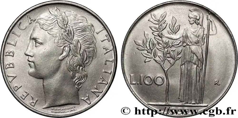 Type : 100 LireDate : 1990Nom de l’atelier/ville : Rome – RQuantité frappée : 60000000Métal : acmonitalDiamètre : 18,20 mmAxe des coins : 6 h.Poids : 3,30 g.Tranche : canneléeRéférence ouvrage :KM20/96.2 AversTitulature avers : REPVBBLICA ITALIANA // ROMAGNOLI / GIAMPAOLI INC..Description avers : Portrait lauré de l’Italie à gauche.ReversTitulature revers : L.100 – R.Description revers : Athéna debout et olivier.CommentaireLe type initial dessiné par Giuseppe Romagnoli et gravé par Pietro Giampaoli a été frappé entre 1950 et 1989 avec un diamètre de 27,8 mm pour un poids de 8 g. Entre 1990 et 1992, le type est repris mais avec une taille réduite 18,20 mm pour un poids de 3,30 g.HistoriqueITALIE