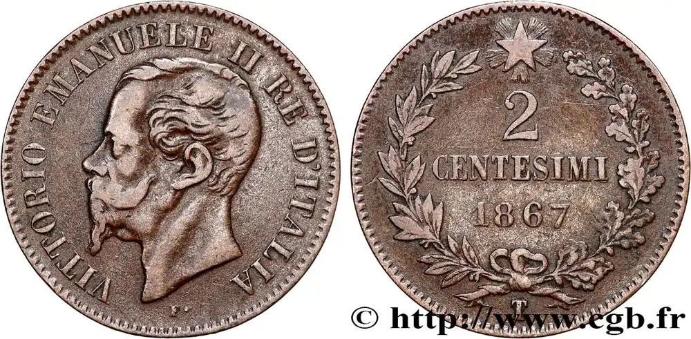 Type : 2 Centesimi Victor Emmanuel IIDate : 1861Nom de l’atelier/ville : MilanQuantité frappée : 21000000Métal : bronzeDiamètre : 20 mmAxe des coins : 6 h.Poids : 2,00 g.Tranche : lisseCommentaires sur l’état de conservation :monnaie nettoyéeRéférence ouvrage :Mont.246 – KM19/2 AversTitulature avers : VITTORIO EMANUELE II RE D’ITALIA.Description avers : portrait à gauche de Victor Emmanuel II.Traduction avers : (Victor Emmanuel II roi d’Italie).ReversTitulature revers : 2 / CENTESIMI / 1861 / M.Description revers : dans le champ, étoile radiée, couronne de laurier et de chêne.HistoriqueITALIE