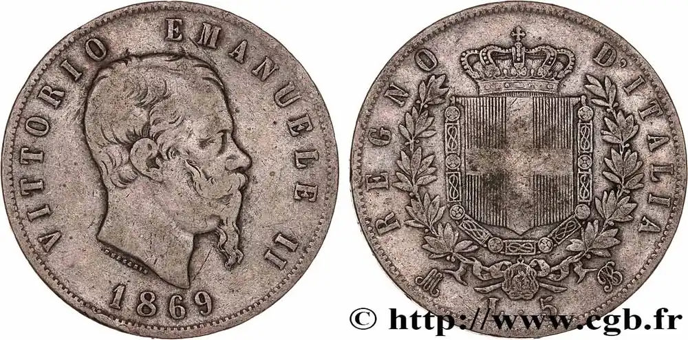 Type : 5 Lire Victor Emmanuel IIDate : 1872Nom de l’atelier/ville : MilanQuantité frappée : 7093156Métal : argentTitre en millième : 900 ‰Diamètre : 37 mmAxe des coins : 6 h.Poids : 24,85 g.Tranche : en creuxRéférence ouvrage :Mont.177 – KM19/8.3 AversTitulature avers : VITTORIO EMANUELE II.Description avers : Tête nue de Victor-Emmanuel II à droite avec signature FERRARIS ; au-dessous, le millésime.Traduction avers : (Victor-Emmanuel II).ReversTitulature revers : REGNO – D’ITALIA./ L. 5.Description revers : Écu de Savoie couronné entouré du collier de l’Ordre de l’Annonciade entre deux branches d’olivier.Traduction revers : (Royaume d’Italie).HistoriqueITALIE