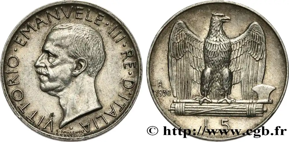 Type : 5 Lire Victor Emmanuel IIIDate : 1927Nom de l’atelier/ville : RomeQuantité frappée : 92887460Métal : argentTitre en millième : 835 ‰Diamètre : 23 mmAxe des coins : 6 h.Poids : 5 g.Tranche : lisseRéférence ouvrage :Mont.119  – KM20/67.1 AversTitulature avers : VITTORIO.EMMANVELE.III.RE.D’ITALIA.Description avers : portrait à gauche.ReversTitulature revers : L.5.Description revers : aigle posé sur une faisceau , date et lettre d’atelier.HistoriqueITALIE