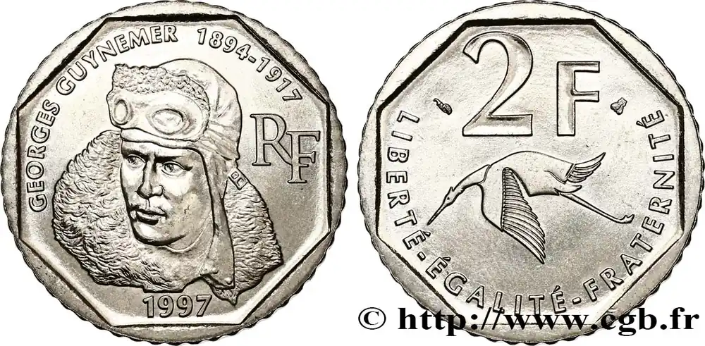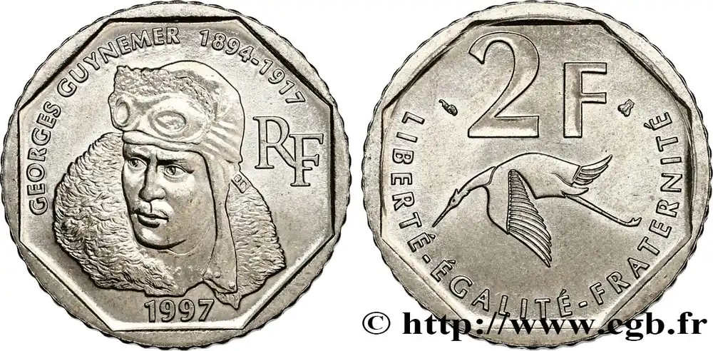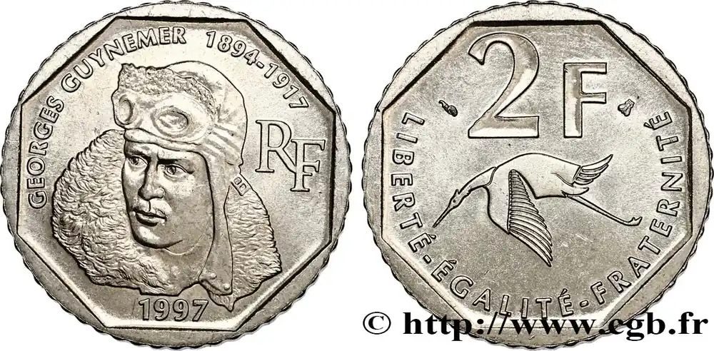 Type : 2 francs Georges GuynemerDate : 1997Quantité frappée : 2.000.013Métal : nickelDiamètre : 26,5 mmAxe des coins : 6 h.Poids : 7,51 g.Tranche : canneléeRéférence ouvrage :Classement FRANC 2023 / FRANC 2023 classificationF.275/2AversTitulature avers : GEORGES GUYNEMER 1894 – 1917 / RF.Description avers : buste habillé de Georges Guynemer, la tête tournée de trois-quarts gauche portant un casque d’aviateur ; au-dessous 1997.ReversTitulature revers : LIBERTÉ – ÉGALITÉ – FRATERNITÉ.Description revers : 2 F encadré des différents au-dessus d’une cigogne volant à gauche.HistoriqueCINQUIÈME RÉPUBLIQUE(depuis le 08/01/1959) La Cinquième République, dont la constitution a été approuvée par référendum le 28 septembre 1958 par plus de 79 % des Français, ne débute officiellement qu’avec l’installation du général de Gaulle comme président le 8 janvier 1959. La constitution est modifiée le 28 octobre 1962 par référendum où une majorité de 62 % des voix approuve l’élection du président de la République au suffrage universel direct. Les différents présidents de la Ve République sont Charles de Gaulle (8/01/1959 – 27/04/1969, retrait et Alain Poher devient président par intérim), Georges Pompidou (15/06/1969 – 2/04/1974, décédé, Alain Poher devient président par intérim), Valéry Giscard d’Estaing (19/05/1974 – 21/05/1981), François Mitterrand (21/05/1981 – 7/05/1995), Jacques Chirac (7/05/1995 – 16/05/2007) , Nicolas Sarkozy (16/05/2007 – 15/05/2012), François Hollande (15/05/2012 – 14/05/2017) et Emmanuel Macron (14/05/2017 – ).