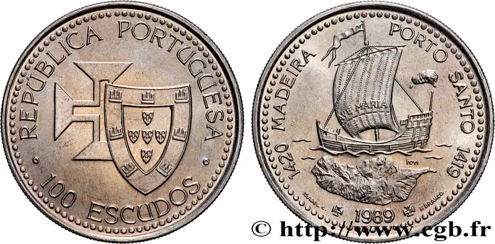 Type : 100 Escudos Découvertes Portugaises de Madère 1420 et Porto Santo 1419Date : 1989Quantité frappée : 2000000Métal : cupro-nickelDiamètre : 34 mmAxe des coins : 6 h.Poids : 16,50 g.Tranche : striéeRéférence ouvrage :KM20/647  – Gom.80.01 AversTitulature avers : REPUBLICA PORTUGUESA // · 100 ESCUDOS ·.Description avers : écu du Portugal sur la croix de l’Ordre du Christ.ReversTitulature revers : 1420 MADEIRA – PORTO SANTO 1419 // AVE MARIA// INCM // ISABEL C ✠ 1989 ✠ F.BRANCO.Description revers : caravelle et carte de Madère.HistoriquePORTUGAL
