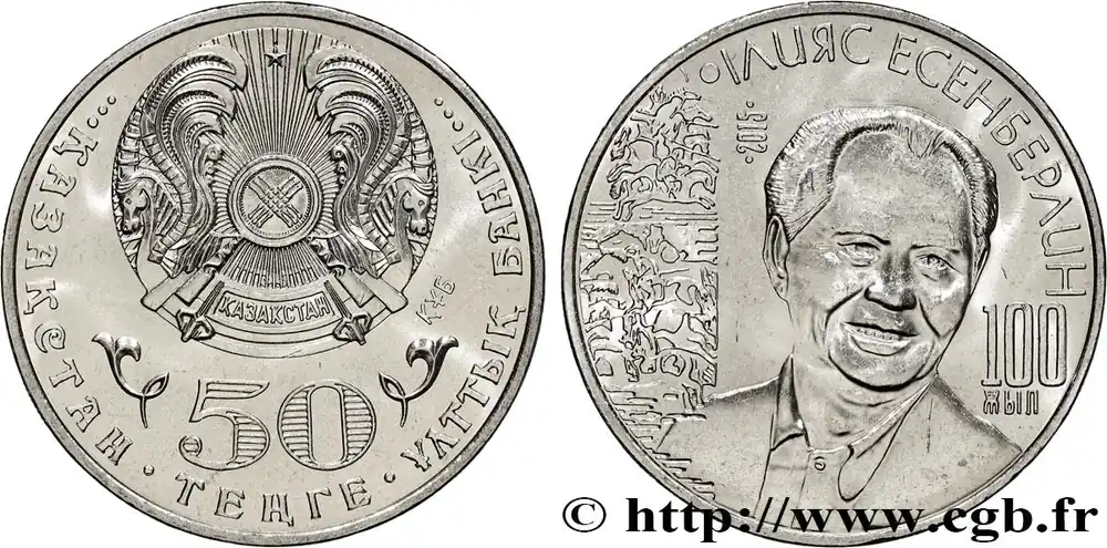 Type : 50 Tenge 100e anniversaire de la naissance de Ilyas EsenberlinDate : 2015Nom de l’atelier/ville : Oust–KamenogorskQuantité frappée : 100000Métal : cupro-nickelDiamètre : 31 mmAxe des coins : 12 h.Poids : 11,17 g.Tranche : séries de canneluresRéférence ouvrage :KM21/320 AversTitulature avers : ҚАЗАҚСТАН ҰЛТТЫҚ БАНКІ // NATIONAL BANK OF KAZAKHSTAN // 50 / ТЕҢГЕ.Description avers : terre dans une main.Traduction avers : (Banque Nationale du Kazakhstan – 50 Tenge).ReversTitulature revers : ІЛИЯС ЕСЕНБЕРЛИН // 2015 // 100 / ЖЫЛ.Description revers : buste de face de Ilyas Esenberlin.Traduction revers : (Ilyas Esenberlin // 2015 // 100 / ans).CommentaireIlyas Esenberlin (1915-1983) était un poète, écrivain et personnalité publique kazakh.HistoriqueKAZAKHSTAN