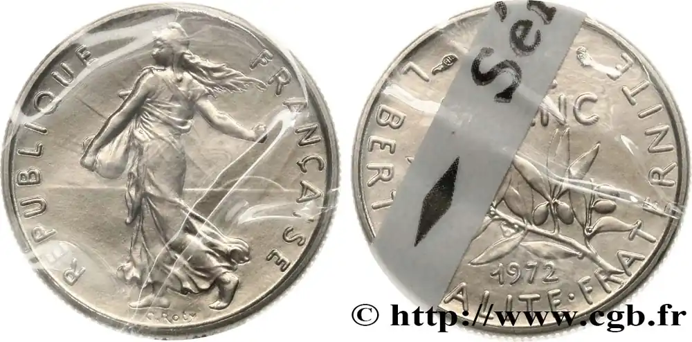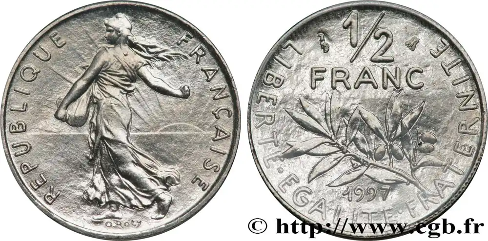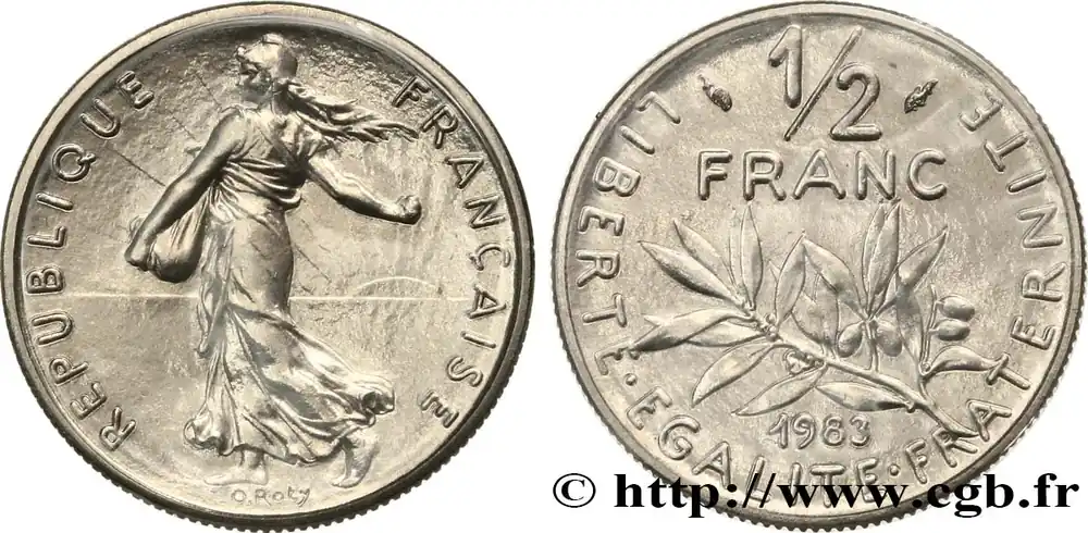 Type : 1/2 franc SemeuseDate : 1983Nom de l’atelier/ville : PessacQuantité frappée : 50000961Métal : nickelDiamètre : 19,5 mmAxe des coins : 6 h.Poids : 4,50 g.Tranche : striéeRéférence ouvrage :Classement FRANC 2023 / FRANC 2023 classificationF.198/22AversTitulature avers : REPUBLIQUEFRANÇAISE.Description avers : La République à gauche, sous les traits d’une semeuse drapée et coiffée d’un bonnet phrygien, aux cheveux longs, marchant et semant à contre-vent ; en arrière-plan, derrière la semeuse à droite, un soleil levant ; au-dessous, en creux O. ROTY.ReversTitulature revers : LIBERTE. EGALITE. FRATERNITE..Description revers : 1/2 / FRANC encadré des différents, en deux lignes au-dessus d’une branche d’olivier ; au-dessous, 1983.CommentaireExemplaire sous plastique provenant d’une série Fleurs De Coins.HistoriqueCINQUIÈME RÉPUBLIQUE(depuis le 08/01/1959) La Cinquième République, dont la constitution a été approuvée par référendum le 28 septembre 1958 par plus de 79 % des Français, ne débute officiellement qu’avec l’installation du général de Gaulle comme président le 8 janvier 1959. La constitution est modifiée le 28 octobre 1962 par référendum où une majorité de 62 % des voix approuve l’élection du président de la République au suffrage universel direct. Les différents présidents de la Ve République sont Charles de Gaulle (8/01/1959 – 27/04/1969, retrait et Alain Poher devient président par intérim), Georges Pompidou (15/06/1969 – 2/04/1974, décédé, Alain Poher devient président par intérim), Valéry Giscard d’Estaing (19/05/1974 – 21/05/1981), François Mitterrand (21/05/1981 – 7/05/1995), Jacques Chirac (7/05/1995 – 16/05/2007) , Nicolas Sarkozy (16/05/2007 – 15/05/2012), François Hollande (15/05/2012 – 14/05/2017) et Emmanuel Macron (14/05/2017 – ).