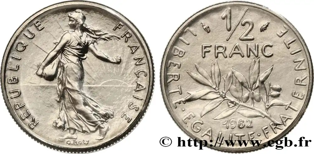 Type : 1/2 franc SemeuseDate : 1983Nom de l’atelier/ville : PessacQuantité frappée : 50000961Métal : nickelDiamètre : 19,5 mmAxe des coins : 6 h.Poids : 4,50 g.Tranche : striéeRéférence ouvrage :Classement FRANC 2023 / FRANC 2023 classificationF.198/22AversTitulature avers : REPUBLIQUEFRANÇAISE.Description avers : La République à gauche, sous les traits d’une semeuse drapée et coiffée d’un bonnet phrygien, aux cheveux longs, marchant et semant à contre-vent ; en arrière-plan, derrière la semeuse à droite, un soleil levant ; au-dessous, en creux O. ROTY.ReversTitulature revers : LIBERTE. EGALITE. FRATERNITE..Description revers : 1/2 / FRANC encadré des différents, en deux lignes au-dessus d’une branche d’olivier ; au-dessous, 1983.CommentaireExemplaire sous plastique provenant d’une série Fleurs De Coins.HistoriqueCINQUIÈME RÉPUBLIQUE(depuis le 08/01/1959) La Cinquième République, dont la constitution a été approuvée par référendum le 28 septembre 1958 par plus de 79 % des Français, ne débute officiellement qu’avec l’installation du général de Gaulle comme président le 8 janvier 1959. La constitution est modifiée le 28 octobre 1962 par référendum où une majorité de 62 % des voix approuve l’élection du président de la République au suffrage universel direct. Les différents présidents de la Ve République sont Charles de Gaulle (8/01/1959 – 27/04/1969, retrait et Alain Poher devient président par intérim), Georges Pompidou (15/06/1969 – 2/04/1974, décédé, Alain Poher devient président par intérim), Valéry Giscard d’Estaing (19/05/1974 – 21/05/1981), François Mitterrand (21/05/1981 – 7/05/1995), Jacques Chirac (7/05/1995 – 16/05/2007) , Nicolas Sarkozy (16/05/2007 – 15/05/2012), François Hollande (15/05/2012 – 14/05/2017) et Emmanuel Macron (14/05/2017 – ).