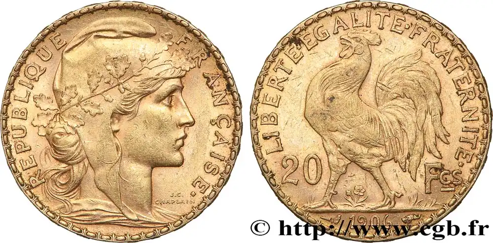 Type : 20 francs or Coq, Dieu protège la FranceDate : 1906Nom de l’atelier/ville : ParisQuantité frappée : 14613010Métal : orTitre en millième : 900 ‰Diamètre : 21 mmAxe des coins : 6 h.Poids : 6,45161g.Tranche : inscrite en relief +* DIEU *+ +* PROTEGE *+ +* LA FRANCE *+Commentaires sur l’état de conservation :Des incrustationsRéférence ouvrage :Classement FRANC 2023 / FRANC 2023 classificationF.534/11AversTitulature avers : REPUBLIQUE – FRANÇAISE..Description avers : Buste de Marianne drapée à droite, coiffée du bonnet phrygien décoré d’une branche de chêne ; signé J.C. CHAPLAIN devant le cou.ReversTitulature revers : LIBERTE EGALITE FRATERNITE// 20 – FCS// 1906.Description revers : Coq passant à gauche, date à l’exergue.HistoriqueOR, PALLADIUM ET PLATINE INVESTISSEMENTSécurisez et diversifiez votre épargne avec les métaux précieux :Dans un contexte d’instabilité politique et économique croissante, diversifier son épargne peut être une démarche judicieuse. Les métaux précieux comme l’or, le palladium et le platine constituent des actifs tangibles souvent prisés en raison de leur caractère intemporel et de leur résilience face aux fluctuations des marchés.Pour répondre à des besoins variés, l’achat de pièces officielles en or, palladium ou platine est une option flexible et adaptée. Ces pièces, disponibles à l’unité ou en lot, permettent à chacun d’ajuster ses choix selon ses objectifs et son budget, sans engagement à long terme.Un processus simple et sécurisé :Nous proposons une livraison sécurisée et garantie. Les paiements peuvent être effectués par carte bancaire ou par virement, bien que certaines transactions puissent nécessiter un règlement exclusivement par virement bancaire. Une pièce d’identité valide (carte nationale d’identité ou passeport) sera demandée pour finaliser votre achat.Stockage en toute sécurité et confidentialité :Le département Investissement de CGB Numismatique Paris met à votre disposition des solutions de stockage offrant une sécurité renforcée et une confidentialité optimale pour vos achats en or, palladium et platine.Contactez-nous pour plus d’informations :Pour toute question ou pour passer commande, prenez contact avec notre responsable des achats/ventes de métaux précieux : par email à [email protected] ou par téléphone. Nous mettons à votre disposition des informations générales et des services pour vous accompagner dans vos projets d’investissement.CGB Numismatique Paris agit en tant que fournisseur de métaux précieux et ne fournit aucun conseil en investissement. La valeur des métaux précieux peut fluctuer, et les performances passées ne garantissent pas les résultats futurs. L’achat de métaux précieux doit être considéré comme une stratégie de préservation de valeur plutôt qu’un investissement spéculatif. Conformément à l’article L.221-28 du Code de la consommation, le droit de rétractation ne s’applique pas aux achats d’or d’investissement, dont le prix dépend des fluctuations des marchés financiers.
