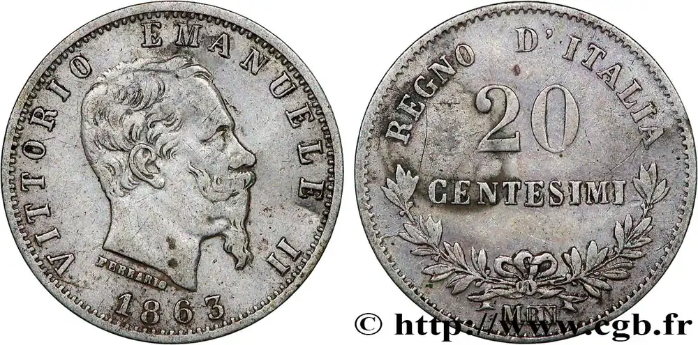Type : 20 Centesimi Victor Emmanuel IIDate : 1863Nom de l’atelier/ville : MilanQuantité frappée : 27844963Métal : argentTitre en millième : 835 ‰Diamètre : 16 mmAxe des coins : 6 h.Poids : 0,95 g.Tranche : lisseRéférence ouvrage :Mont.226  – KM19/13.1 AversTitulature avers : VITTORIO EMANUELE II // 1863.Description avers : Tête nue à droite de Victor Emmanuel II.ReversTitulature revers : REGNO D’ITALIA // 20 CENTESIMI.Description revers : dans la champ, couronne de laurier.HistoriqueITALIE