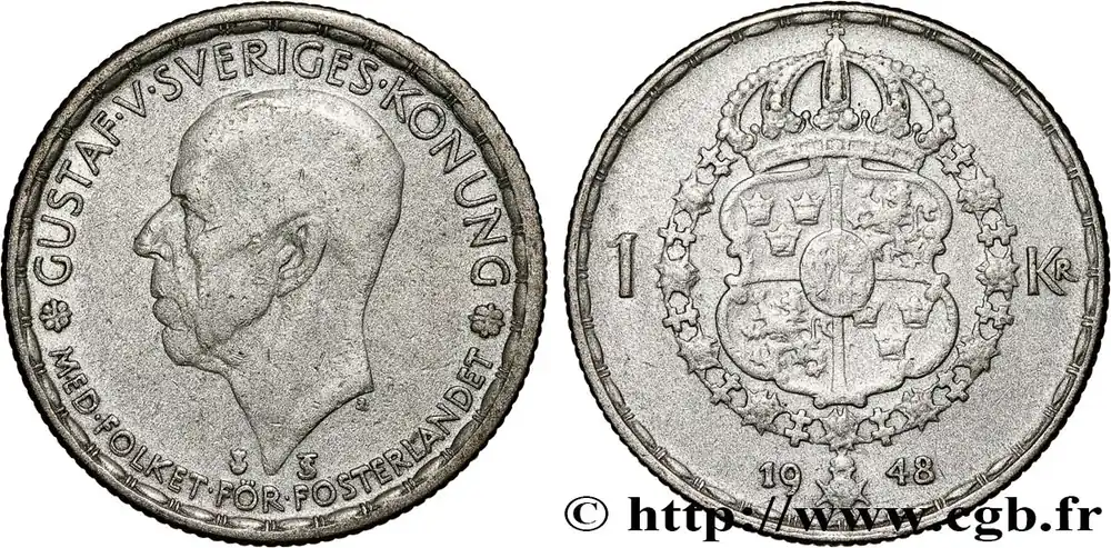 Type : 1 Krona Gustave VDate : 1947Quantité frappée : 9124335Métal : argentTitre en millième : 400 ‰Diamètre : 25 mmAxe des coins : 12 h.Poids : 6,99 g.Tranche : canneléeRéférence ouvrage :KM20/814 AversTitulature avers : GUSTAF·V·SVERIGES·KONUNG // MED·FOLKET·FÖR·FOSTERLANDET.Description avers : portrait à gauche du roi Gustave V.Traduction avers : (Gustave V roi de Suède // avec le peuple pour la patrie).ReversTitulature revers : 1 – KR // 19 – 47.Description revers : armes couronnée de Suède entourées du grand collier de l’ordre royal du Séraphin.HistoriqueSUÈDE