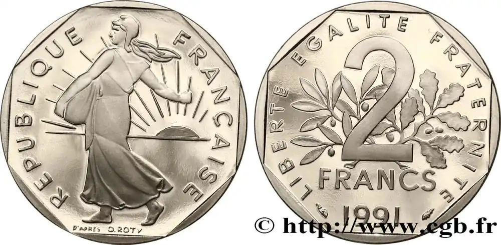 Type : 2 francs Semeuse, nickel, BE (Belle Épreuve)Date : 1996Nom de l’atelier/ville : PessacQuantité frappée : 5319Métal : nickelDiamètre : 26,5 mmAxe des coins : 6 h.Poids : 7,50 g.Tranche : lisseRéférence ouvrage :Classement FRANC 2023 / FRANC 2023 classificationF.272/24 var.AversTitulature avers : REPUBLIQUEFRANÇAISE..Description avers : La République à gauche, sous les traits d’une semeuse drapée et coiffée d’un bonnet phrygien, aux cheveux longs, marchant et semant à contre-vent ; en arrière-plan, derrière la semeuse à droite, un soleil levant ; au-dessous, D’APRÈS O. ROTY.ReversTitulature revers : LIBERTE EGALITE FRATERNITE..Description revers : 2 / FRANCS, brochant sur une branche d’olivier et une branche de chêne entrecroisées à leur base ; au-dessous 1996 encadré des différents.CommentaireExemplaire sous capsule issu d’une série Belle Épreuve.HistoriqueCINQUIÈME RÉPUBLIQUE(depuis le 08/01/1959) La Cinquième République, dont la constitution a été approuvée par référendum le 28 septembre 1958 par plus de 79 % des Français, ne débute officiellement qu’avec l’installation du général de Gaulle comme président le 8 janvier 1959. La constitution est modifiée le 28 octobre 1962 par référendum où une majorité de 62 % des voix approuve l’élection du président de la République au suffrage universel direct. Les différents présidents de la Ve République sont Charles de Gaulle (8/01/1959 – 27/04/1969, retrait et Alain Poher devient président par intérim), Georges Pompidou (15/06/1969 – 2/04/1974, décédé, Alain Poher devient président par intérim), Valéry Giscard d’Estaing (19/05/1974 – 21/05/1981), François Mitterrand (21/05/1981 – 7/05/1995), Jacques Chirac (7/05/1995 – 16/05/2007) , Nicolas Sarkozy (16/05/2007 – 15/05/2012), François Hollande (15/05/2012 – 14/05/2017) et Emmanuel Macron (14/05/2017 – ).