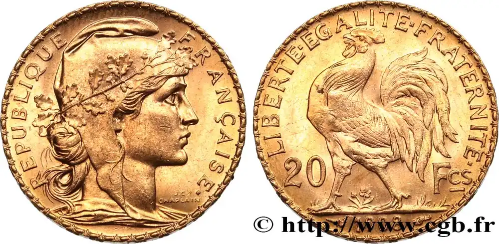 Type : 20 francs or Coq, Liberté Égalité FraternitéDate : 1911Nom de l’atelier/ville : ParisQuantité frappée : 5346044Métal : orTitre en millième : 900 ‰Diamètre : 21 mmAxe des coins : 6 h.Poids : 6,45 g.Tranche : inscrite en relief +* LIBERTE +* EGALITE +* FRATERNITE *+Référence ouvrage :Classement FRANC 2023 / FRANC 2023 classificationF.535/5AversTitulature avers : REPUBLIQUE – FRANÇAISE..Description avers : Buste de Marianne drapée à droite, coiffée du bonnet phrygien décoré d’une branche de chêne ; signé J.C. CHAPLAIN devant le cou.ReversTitulature revers : LIBERTE EGALITE FRATERNITE // 20 – FCS // 1911.Description revers : Coq passant à gauche, date à l’exergue.HistoriqueTROISIÈME RÉPUBLIQUE(4/09/1870-10/07/1940) La nouvelle de la capitulation de Sedan provoque la révolution du 4 septembre 1870 à Paris. Proclamée à l’Hôtel de Ville, la République est dotée d’un gouvernement provisoire appelé gouvernement de la Défense nationale. Menacé à gauche par l’insurrection de la Commune et à droite par les monarchistes, le nouveau régime connaît des débuts difficiles. Chef du pouvoir exécutif dans un premier temps (février 1871), Thiers est chargé de réorganiser le pays avant de choisir sa forme de gouvernement. Il devient président de la République en août 1871 et, malgré son action de libération du territoire, doit quitter son poste en mars 1873 face à l’opposition royaliste. Il est alors remplacé par Mac-Mahon favorable au rétablissement de la monarchie mais celle-ci n’est pas restaurée à la suite de la question du drapeau. La loi du septennat est alors mise en place en novembre 1873 puis, en 1875, sont votées les lois fondamentales qui servent de Constitution à la Troisième République. Régime parlementaire, elle se caractérise notamment par la nette prépondérance du pouvoir législatif sur le pouvoir exécutif. Anticléricale, la Troisième République rend l’école gratuite, laïque et obligatoire mais continue la politique coloniale pour ses ambitions économiques, stratégiques et morales. La séparation des Églises et de l’État est votée en 1905. L’idée d’une revanche sur l’Allemagne et un nationalisme important sont au cœur de la crise boulangiste, du scandale de Panama ou de l’affaire Dreyfus des années 1886-1899 tandis que la politique étrangère est très active notamment au Maroc et que la course aux armements se développe. La Première Guerre mondiale coûte cher à la France qui ne se relève qu’à partir de 1920 voire 1928 pour la monnaie avec le franc « Poincaré ». La crise de 1929 ne se fait sentir qu’à partir de 1932 mais dure jusqu’en 1939, période durant laquelle l’instabilité ministérielle est très importante. Vacillant en 1934, la Troisième République trouve un nouveau ciment unitaire avec l’antifascisme qui permet l’arrivée au pouvoir du Front populaire en 1936. Mais, paralysée face à l’Allemagne, la France va alors s’enliser dans une « drôle de guerre » puis connaître l’une des plus grandes défaites de son histoire en juin 1940. Réunies en Assemblée nationale à Vichy le 10 juillet 1940, les Chambres, pourtant élues en 1936, votent les pleins pouvoirs à Pétain dans une sorte de suicide collectif par 569 voix pour, 80 voix contre et 18 abstentions.