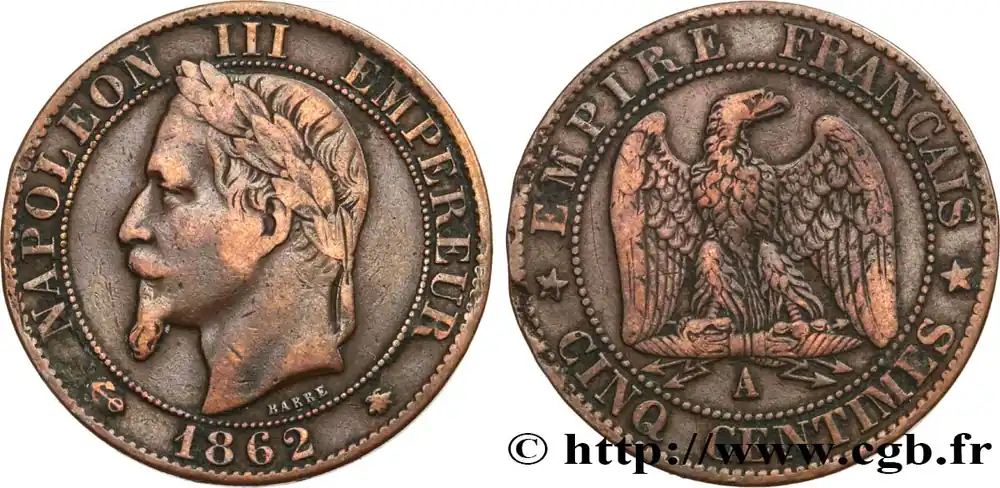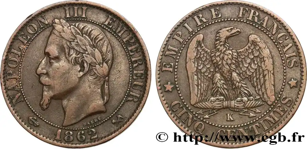 Type : Cinq centimes Napoléon III, tête lauréeDate : 1863Nom de l’atelier/ville : BordeauxQuantité frappée : 9437336Métal : bronzeDiamètre : 25 mmAxe des coins : 6 h.Poids : 4,63 g.Tranche : lisseRéférence ouvrage :Classement FRANC 2023 / FRANC 2023 classificationF.117/12AversTitulature avers : NAPOLEON III – EMPEREUR// 1863.Description avers : Tête laurée de Napoléon III à gauche ; signé BARRE au-dessous.ReversTitulature revers : EMPIRE – FRANÇAIS// * CINQ CENTIMES *.Description revers : Aigle debout sur un foudre, les ailes ouvertes, la tête tournée à droite ; au-dessous K.HistoriqueSECOND EMPIRE(02/12/1852-04/09/1870) Proclamé empereur sous le nom de Napoléon III, Louis Napoléon fait son entrée solennelle à Paris le 2 décembre 1852. Il épouse Eugénie Marie de Montijo, aristocrate espagnole, en janvier 1853. Son règne peut se diviser en trois périodes : l’Empire autoritaire jusqu’en 1860 ; l’Empire libéral de 1860 à 1870 puis l’Empire parlementaire en 1870. Durant l’Empire autoritaire, Napoléon III exerce son pouvoir sans partage, contrôle la presse tandis que les journaux pratiquent l’autocensure pour éviter leur suppression. Les préfets exercent une puissance illimitée dans les départements, les maires, les fonctionnaires sont nommés par le gouvernement. Comme sous le Premier Empire, l’Éducation et l’Université sont surveillées. Maintenant les grands principes de la révolution, la souveraineté du peuple est continuée grâce à la consultation par plébiscite. Sur le plan économique, l’essor est important, l’industrialisation se développe ainsi que les organismes de crédit et les grands magasins. Le prestige militaire est accru par la guerre de Crimée qui permet à la France de jouer un rôle international. L’attentat d’Orsini (janvier 1858) n’empêche nullement la France d’intervenir en Italie pour faire triompher le principe des nationalités et permet le rattachement de Nice et de la Savoie par le traité de Turin (mars 1860). Dès 1860, l’Empire évolue vers plus de libertés : traité libre-échangiste de commerce avec l’Angleterre, apparition d’une faible opposition dans le Corps législatif, octroi du droit de grève (1864), libéralisation de la presse (1868). Sur le plan international, la France acquiert la Nouvelle-Calédonie, la Cochinchine et encourage le creusement du canal de Suez par Ferdinand de Lesseps. Au Mexique, le soutien à Maximilien et à l’Autriche est toutefois un échec. Les élections de 1869 sont très mauvaises pour le régime et l’opposition obtient 45 % des voix. Le régime évolue alors vers un Empire parlementaire en appelant Émile Ollivier, chef du parti orléaniste et libéral, au pouvoir. Après Sadowa en 1866 où la Prusse écrase l’Autriche, l’affaire du trône d’Espagne et de la dépêche d’Ems entraînent la guerre qui est déclarée le 19 juillet 1870. Accumulant les revers, l’armée française est encerclée dans Metz puis Napoléon III, malade, capitule à Sedan le 2 septembre. Aussitôt la nouvelle connue, la déchéance de l’Empire est annoncée par Gambetta puis la République est proclamée le 4 septembre. Napoléon III est alors emmené en captivité en Hesse puis part dans le Kent où il meurt en 1873.