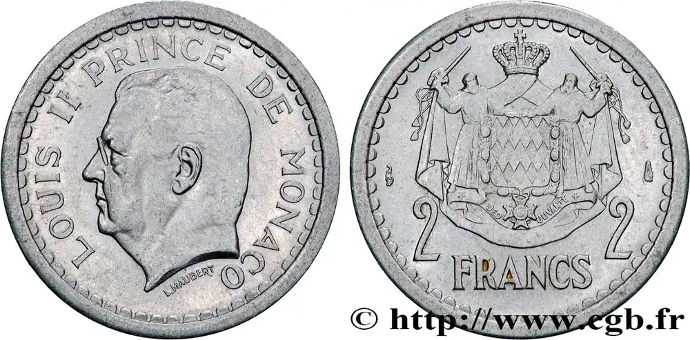 Type : 2 Francs Louis IIDate : (1943)Nom de l’atelier/ville : ParisQuantité frappée : 1082687Métal : bronze-aluminiumDiamètre : 23 mmAxe des coins : 6 h.Poids : 7,94 g.Tranche : lisseRéférence ouvrage :G.2019.132 – KM20/124 AversTitulature avers : LOUIS II PRINCE DE MONACO.Description avers : Tête à gauche de Louis II ; signé L. MAUBERT.ReversTitulature revers : 2 – 2 / FRANCS.Description revers : Écu aux armes des Grimaldi soutenu par deux moines posé sur un manteau couronné.CommentaireMonnaie non datée. Selon le Gadoury, les monnaies en aluminium et cupro-aluminium ont été frappées en 1943. Les frappes en cupro-aluminium n’ont été mises en circulation qu’en 1945.HistoriqueMONACO