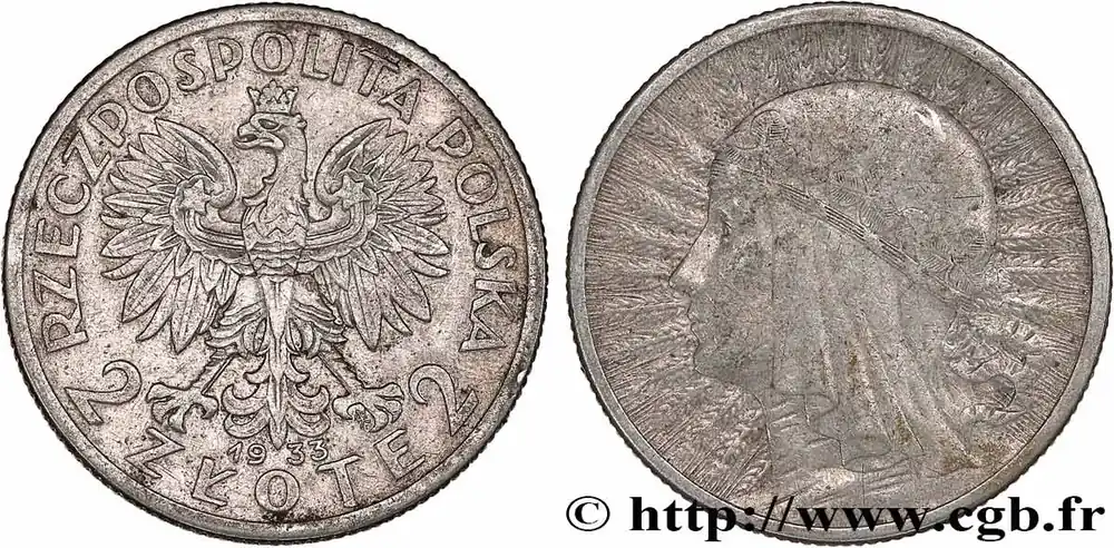 Type : 2 Zlote Reine JadwigaDate : 1932Nom de l’atelier/ville : VarsovieQuantité frappée : 15700000Métal : argentTitre en millième : 750 ‰Diamètre : 22 mmAxe des coins : 12 h.Poids : 4,26 g.Tranche : canneléeCommentaires sur l’état de conservation :Légères traces de nettoyageRéférence ouvrage :KM20/20 AversTitulature avers : RZECZPOSPOLITA POLSKA / 2 ZŁOTE 2.Description avers : emblème à l’aigle couronné.ReversDescription revers : portrait à gauche de la Reine Jadwiga, épis de blé.HistoriquePOLOGNE