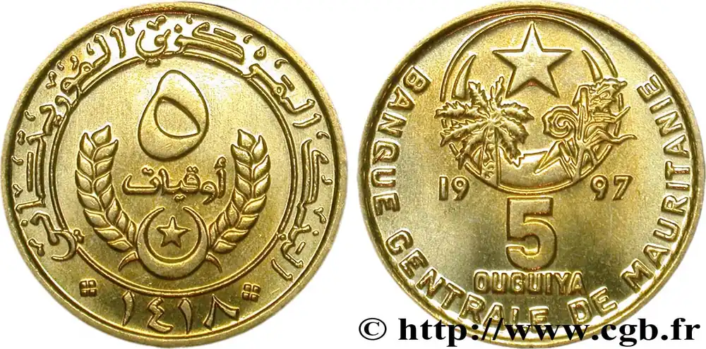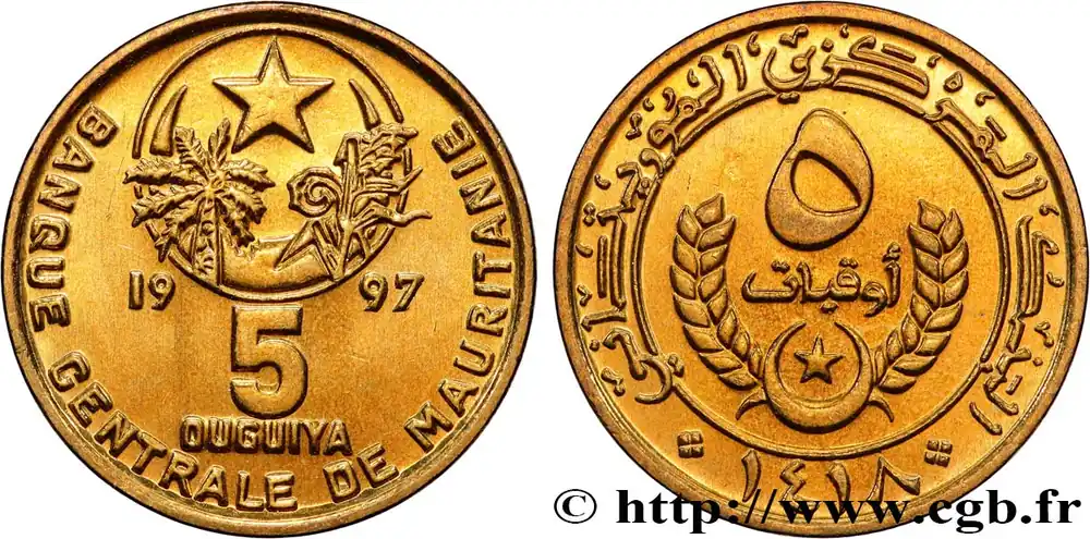 Type : 5 Ouguiya AH 1418Date : 1997Quantité frappée : -Métal : cupro-nickel-aluminiumDiamètre : 25 mmAxe des coins : 12 h.Poids : 5,88 g.Tranche : lisseRéférence ouvrage :KM20/3 AversTitulature avers : 19 – 97 / 5 / OUGUIYA / BANQUE CENTRALE DE MAURITANIE.Description avers : emblème de la République de Mauritanie.ReversTitulature revers : (LÉGENDE EN ARABE) CROISSANT ET ÉTOILE ENTRE DEUX ÉPIS.Description revers : dans le champ.HistoriqueMAURITANIE