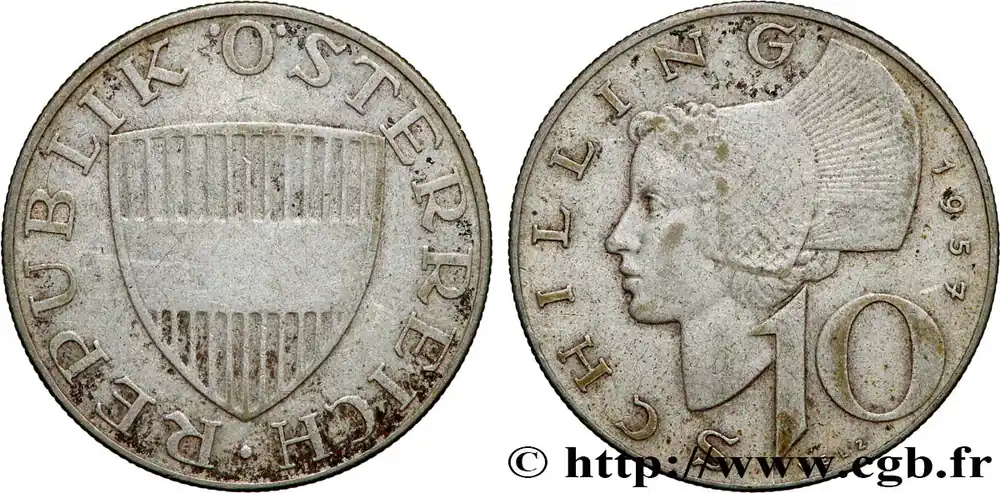 Type : 10 SchillingDate : 1958Quantité frappée : 27280000Métal : argentTitre en millième : 640 ‰Diamètre : 27 mmAxe des coins : 12 h.Poids : 7,53 g.Tranche : canneléeCommentaires sur l’état de conservation :Monnaie nettoyéeRéférence ouvrage :KM20/2882 AversTitulature avers : REPUBLIK ÖSTERREICH..Description avers : écu de l’Autriche.Traduction avers : (République d’Autriche).ReversTitulature revers : 10 SCHILLING (DATE).Description revers : femme coiffée du goldhaube traditionnel du Wachau .HistoriqueAUTRICHE