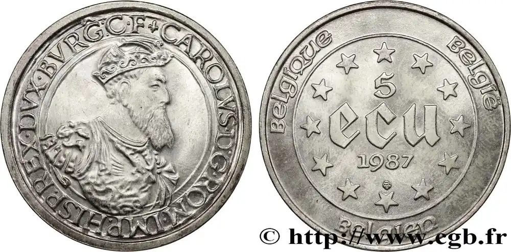Type : 5 Ecu Charles QuintDate : 1987Quantité frappée : 985000Métal : argentTitre en millième : 833 ‰Diamètre : 37 mmAxe des coins : 6 h.Poids : 22,85 g.Tranche : lisseRéférence ouvrage :KM20/166 AversTitulature avers : CAROLVS.DG.ROM.IMP.HISP.REX.DVX.BVRG:G.F.Description avers : Buste de Charles Quint à droite.ReversTitulature revers : 5 ECU 1987 / BELGIQUE / BELGIE / BELGIEN.Description revers : dans le champ entouré d’étoiles.HistoriqueBELGIQUE