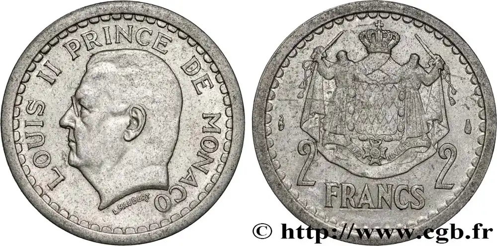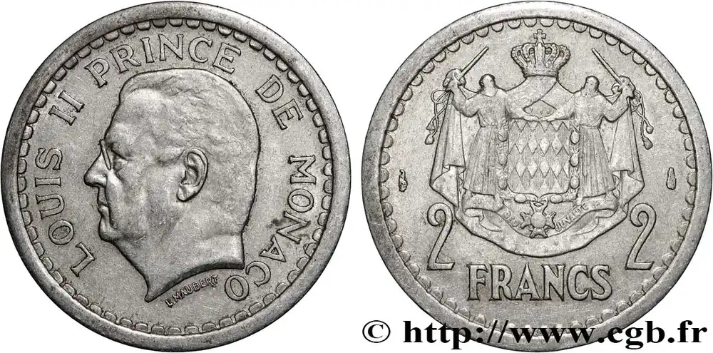 Type : 2 Francs Louis IIDate : (1943)Nom de l’atelier/ville : ParisQuantité frappée : 1082687Métal : bronze-aluminiumDiamètre : 23 mmAxe des coins : 6 h.Poids : 7,92 g.Tranche : lisseRéférence ouvrage :G.2019.132 – KM20/124 AversTitulature avers : LOUIS II PRINCE DE MONACO.Description avers : Tête à gauche de Louis II ; signé L. MAUBERT.ReversTitulature revers : 2 – 2 / FRANCS.Description revers : Écu aux armes des Grimaldi soutenu par deux moines posé sur un manteau couronné.CommentaireMonnaie non datée. Selon le Gadoury, les monnaies en aluminium et cupro-aluminium ont été frappées en 1943. Les frappes en cupro-aluminium n’ont été mises en circulation qu’en 1945.HistoriqueMONACO