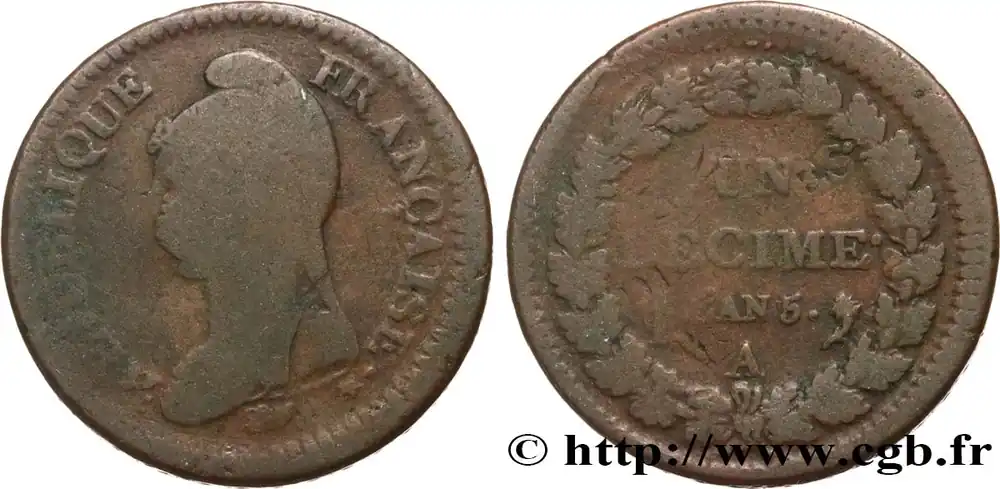 Type : Un décime Dupré, grand module, « refrappage » du 2 décimesDate : An 5 (1796-1797)Nom de l’atelier/ville : ParisQuantité frappée : 12463719Métal : cuivreDiamètre : 32,48 mmAxe des coins : 6 h.Poids : 20,50 g.Tranche : macléeRéférence ouvrage :Classement FRANC 2023 / FRANC 2023 classificationF.128/1AversTitulature avers : REPUBLIQUE FRANÇAISE..Description avers : Buste drapé de la Liberté à gauche coiffée du bonnet phrygien (Mesdames Tallien ou Récamier) ; signé Dupré cursif au-dessous.ReversTitulature revers : UN / DÉCIME..Description revers : En deux lignes dans le champ, au-dessus de L’AN 5 suivi d’un point et de la lettre d’atelier A encadrés des différents, dans une couronne fermée composée de deux branches de chêne opposées nouées à leur base par un ruban.HistoriqueDIRECTOIRE(26/10/1795-9-10/11/1799) Lors de la séparation de la Convention, le 25 octobre 1795, un nouveau pouvoir exécutif prévu par la constitution thermidorienne se met en place. Cette constitution prévoit de confier le pouvoir à un directoire de cinq membres dont chacun préside à tour de rôle avec remplacement d’un membre tous les deux ans. Ce directoire nomme les ministres et les fonctionnaires, dirige la politique étrangère et fait exécuter les lois mais il ne les élabore pas et n’a aucun contrôle des deniers publics. Le pouvoir est partagé avec deux chambres : le Conseil des Cinq-Cents et le Conseil des Anciens qui forment le Corps législatif. Ce pouvoir est résolu à se maintenir face au risque d’une restauration monarchique ou d’une réaction jacobine mais il est surtout paralysé par la crise financière et doit renoncer à l’assignat en 1796. Le remplacement des assignats par les mandats territoriaux n’inspire pas plus de confiance et cette nouvelle monnaie fiduciaire est supprimée en 1797. Face à la misère et aux tentatives de déstabilisation, le Directoire, accusé d’être une « république bourgeoise », revient aux mesures révolutionnaires et policières. Par ailleurs, depuis 1792, la guerre est ininterrompue et l’influence des chefs militaires est croissante. En 1799, les partisans d’un pouvoir fort, dont Sieyès, se retrouvent au Directoire et ils ouvrent la voie du pouvoir à Bonaparte, de retour d’Égypte. Le coup d’État des 18 et 19 brumaire an VIII permet l’instauration d’une dictature militaire sous le nom de Consulat.